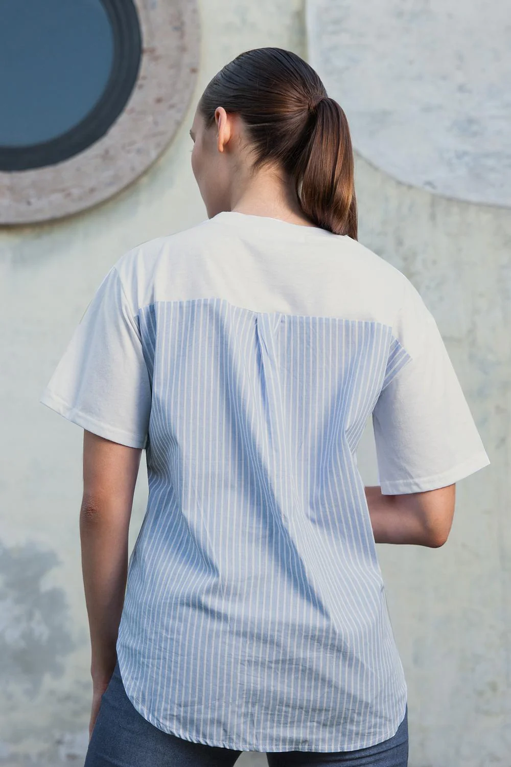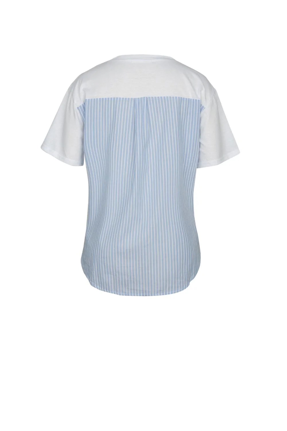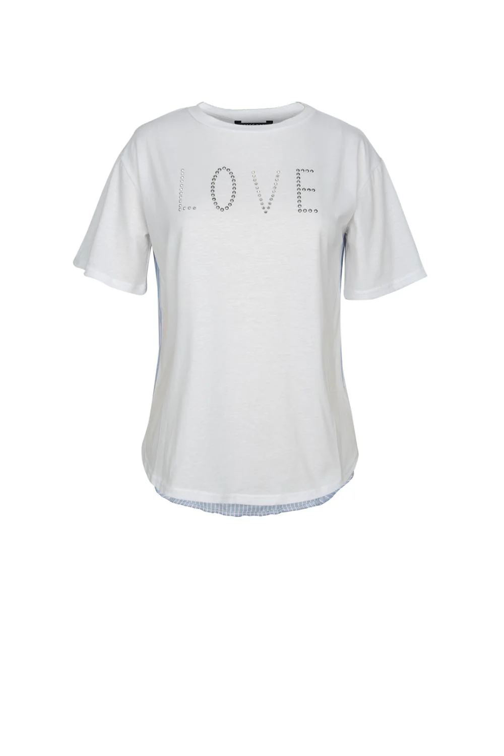 Blusa de fit relajado en combinación de materiales, escote redondo, mangas cortas, aplicación frontal decorativa con estoperoles y cristales de fantasía. 27-2706