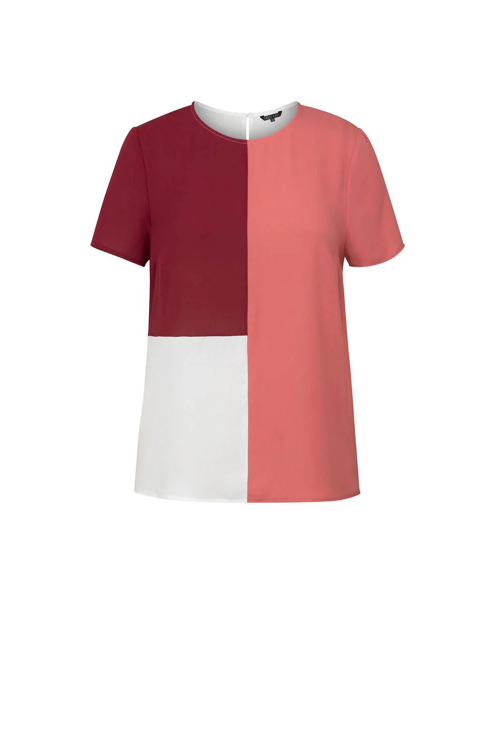 - Blusa con bloques de color, cuello redondo y mangas cortas.