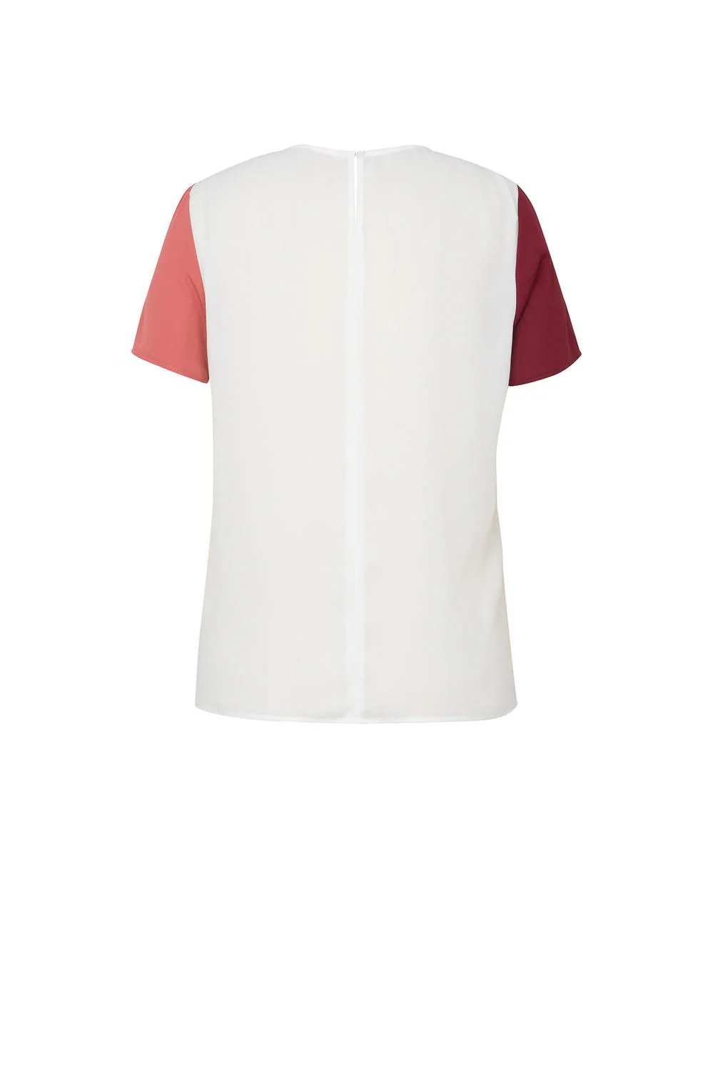 Blusa con bloques de color, cuello redondo y mangas cortas.