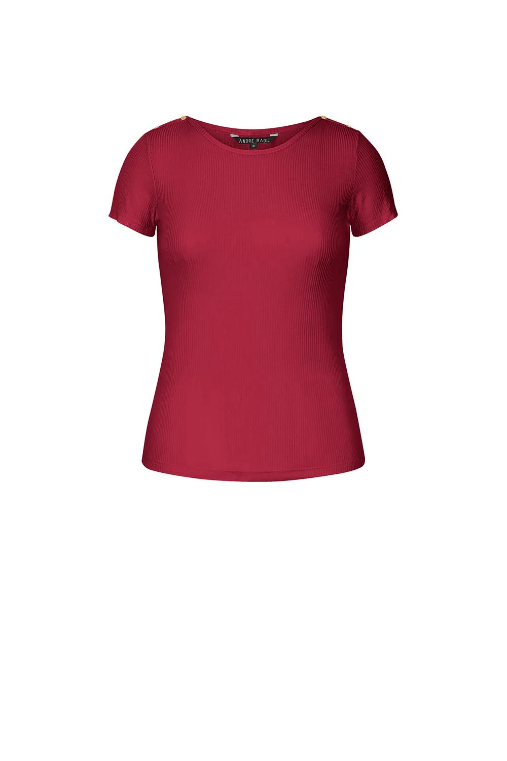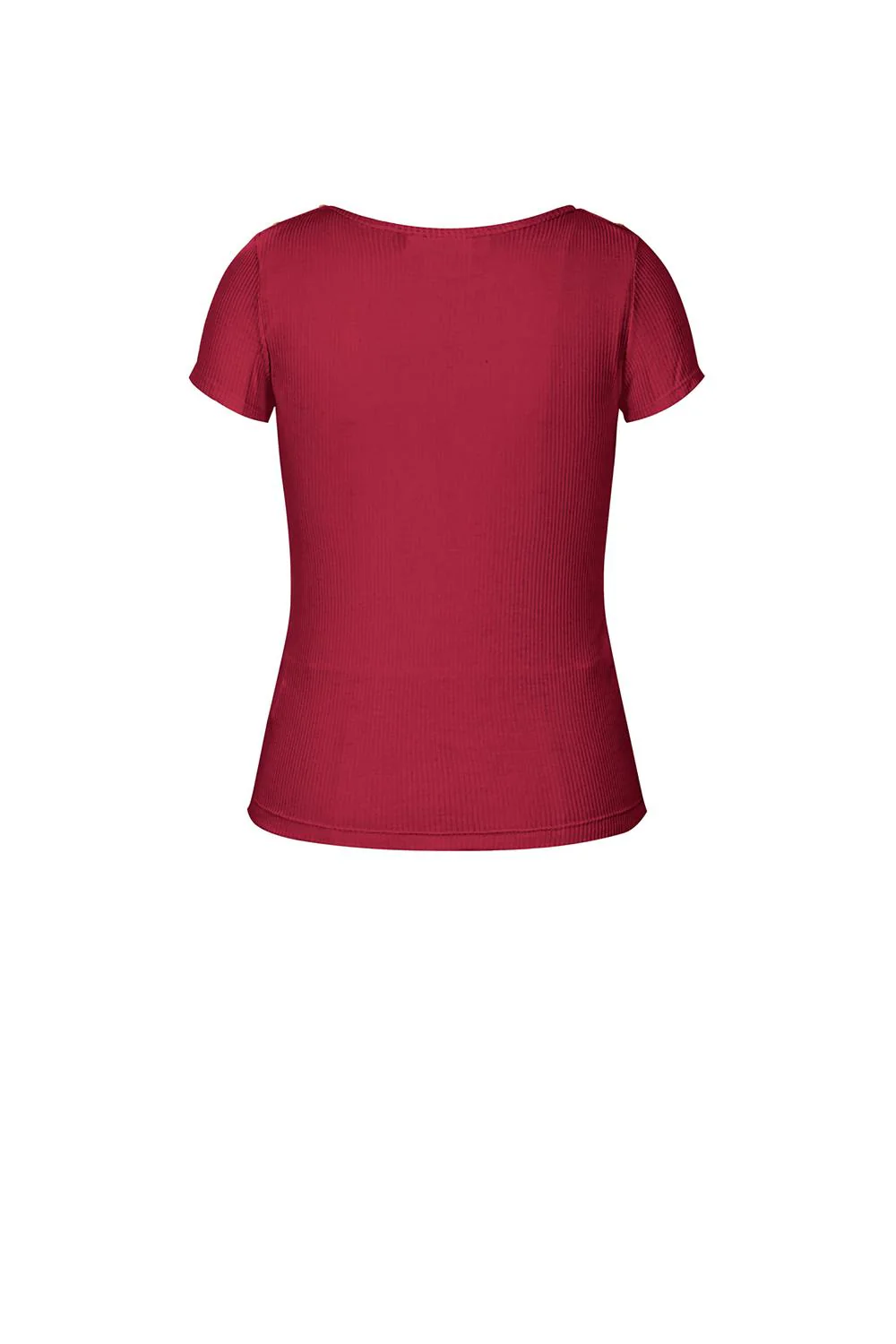 • Blusa de rib con cuello redondo, manga corta y botones decorativos en hombro.