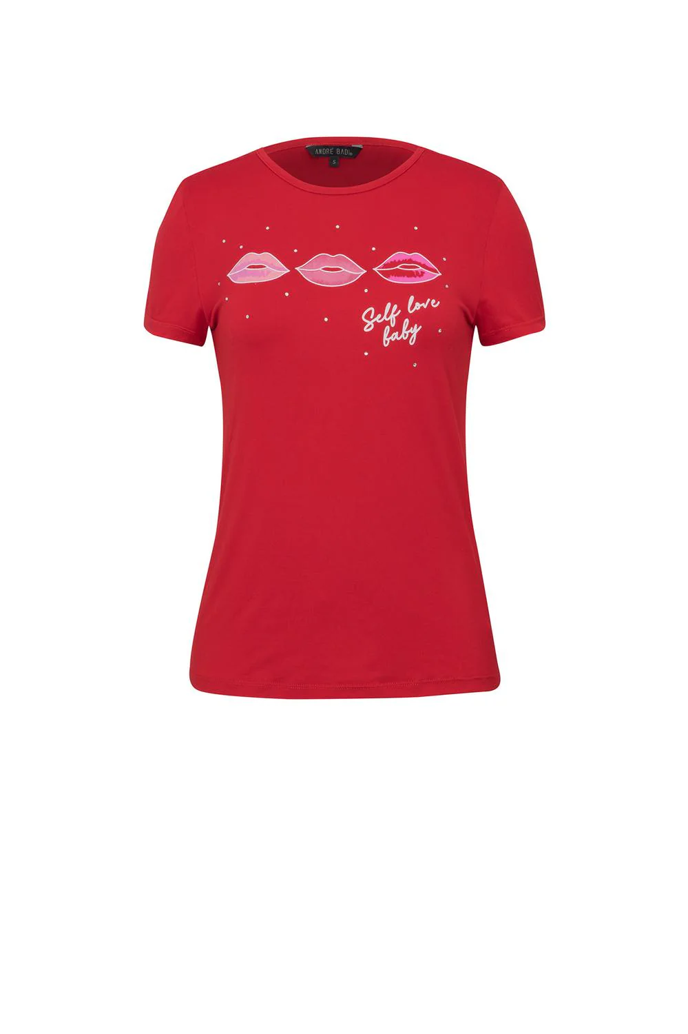Blusa con cuello redondo, mangas cortas, estampado frontal y aplicaciones decorativas. Código de producto 27-2124