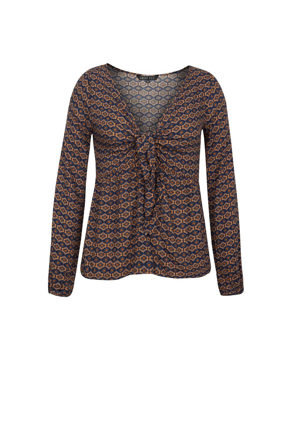 • Blusa estampada, escote en ”V” con detalle anudado, botonadura frontal, mangas largas y elástico en puño.