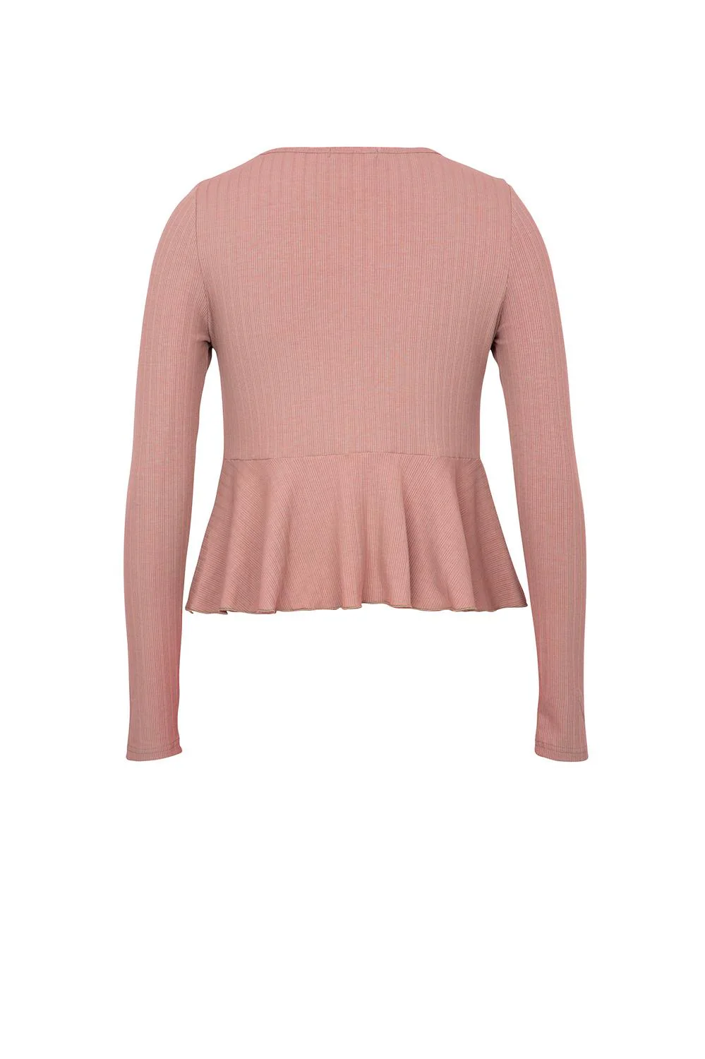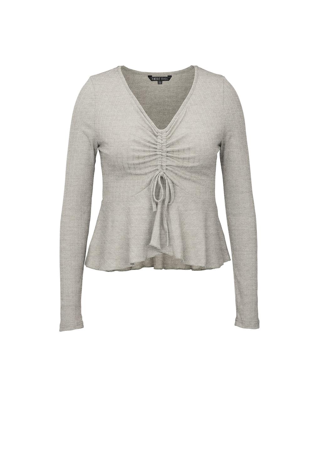 Blusa con escote en “V“, jaretas ajustables en delantero, olan en ruedo y mangas largas.