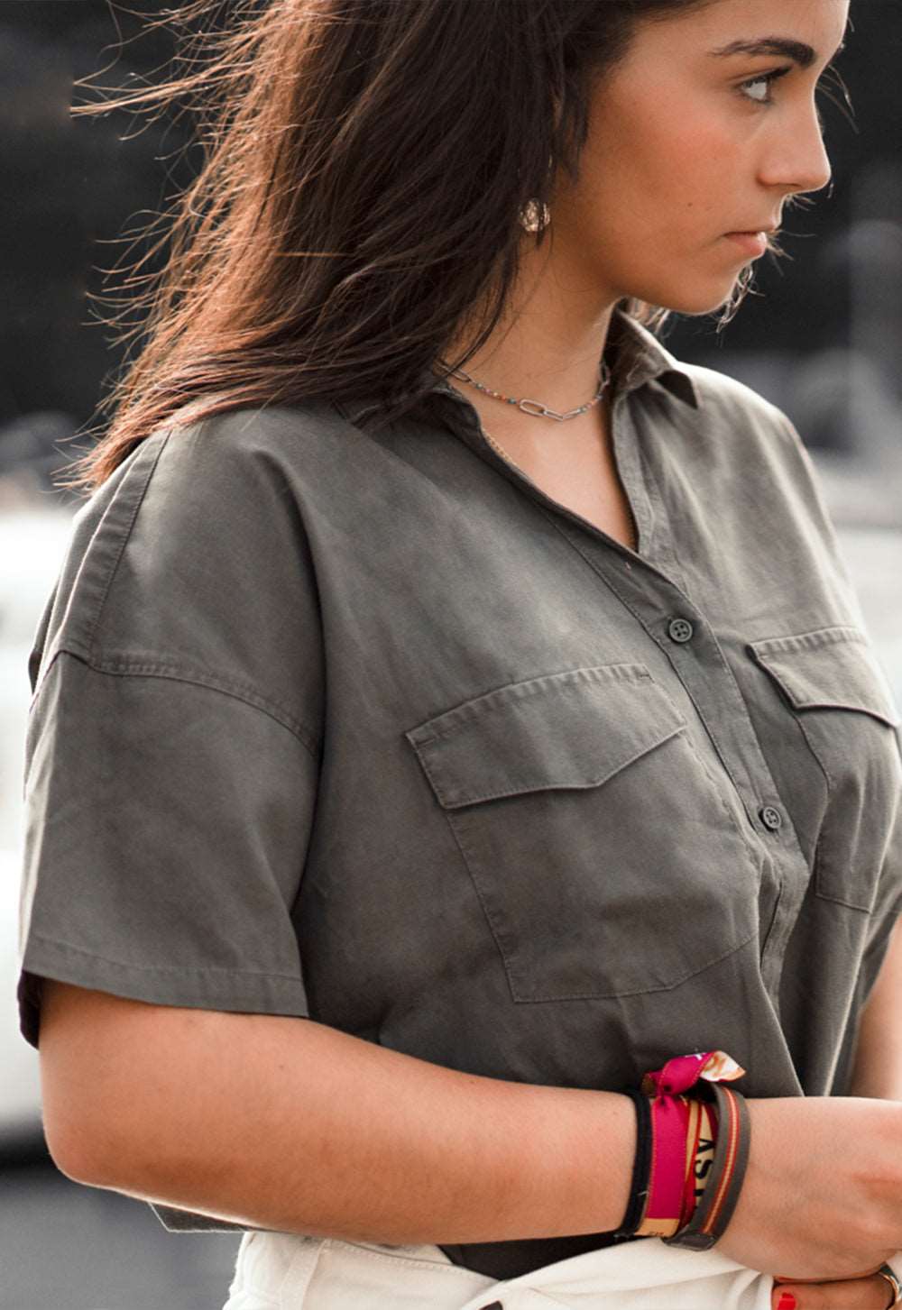 Bolsillos en el pecho y escote en pico