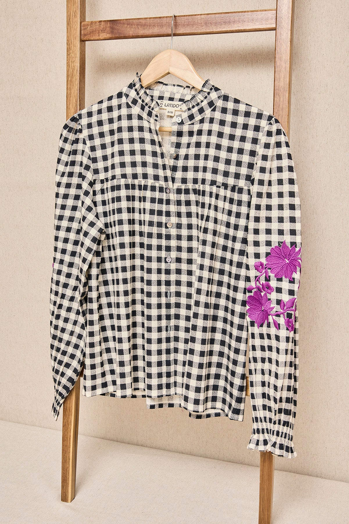 Blusa de viscosa con estampado de cuadros y bordados de hilo en las mangas. Cuenta con un cuello mao fruncido y las mangas abullonadas con puños elásticos. Cierre con botones.