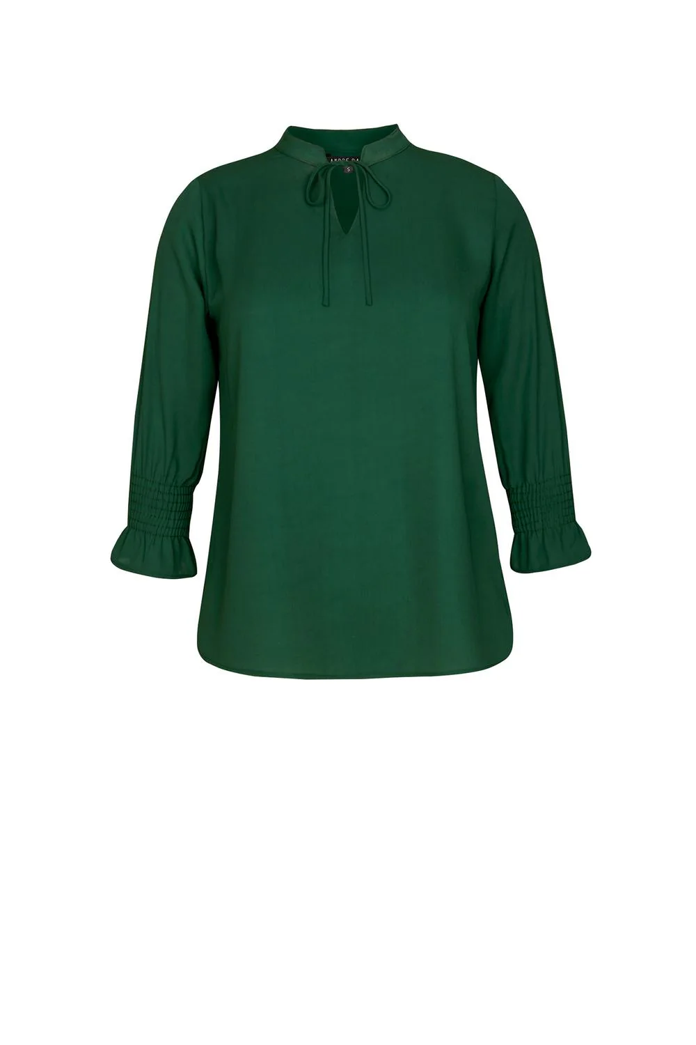 Blusa, escote redondo con lazo, abertura frontal, mangas 3/4 y smock en puños. 27-2691