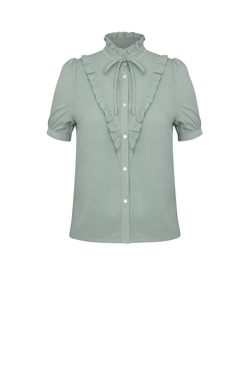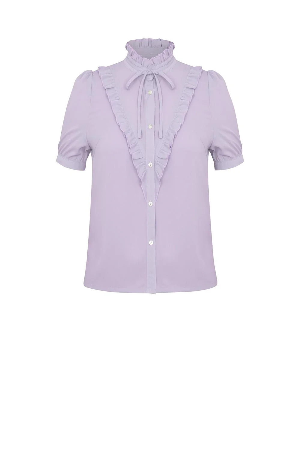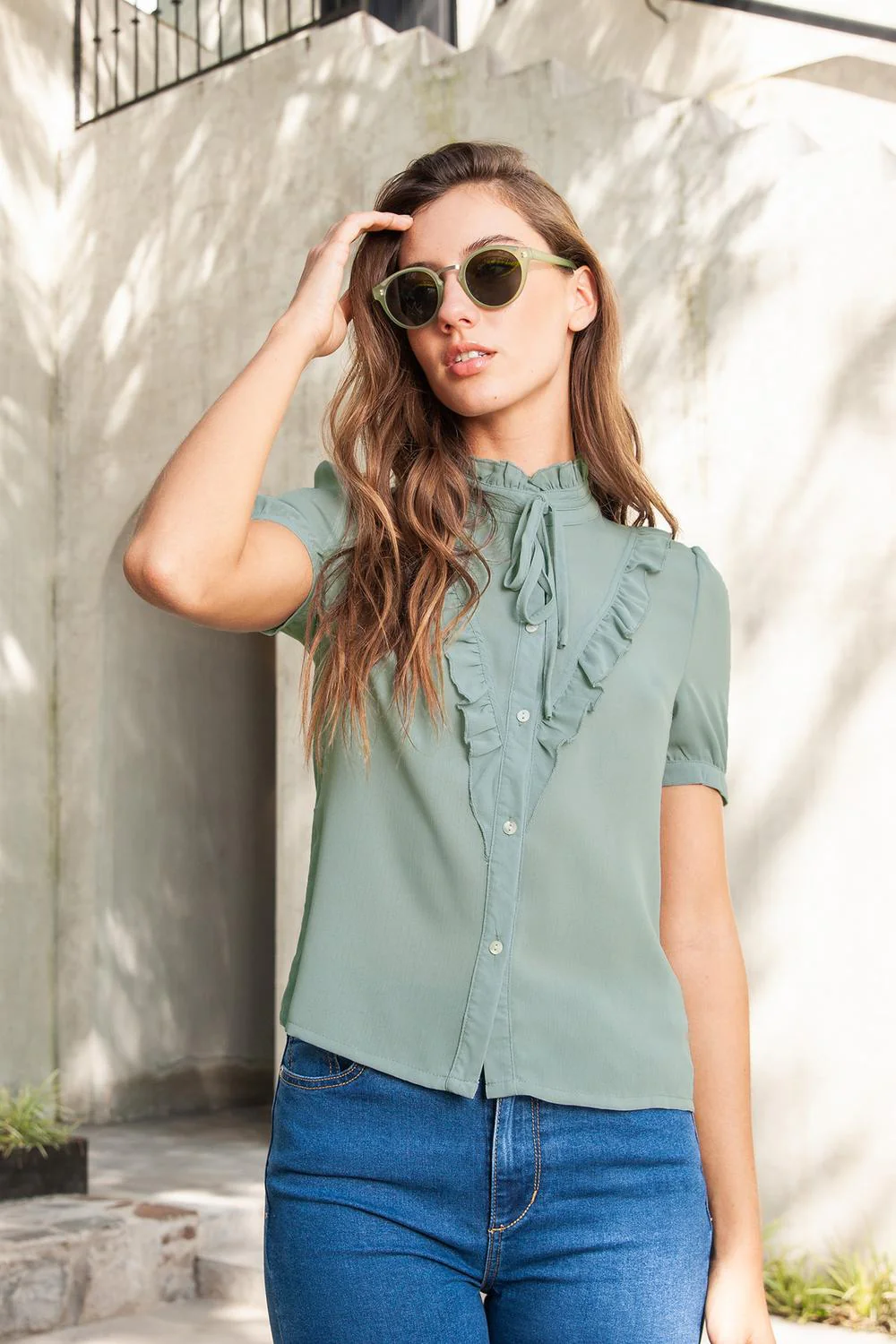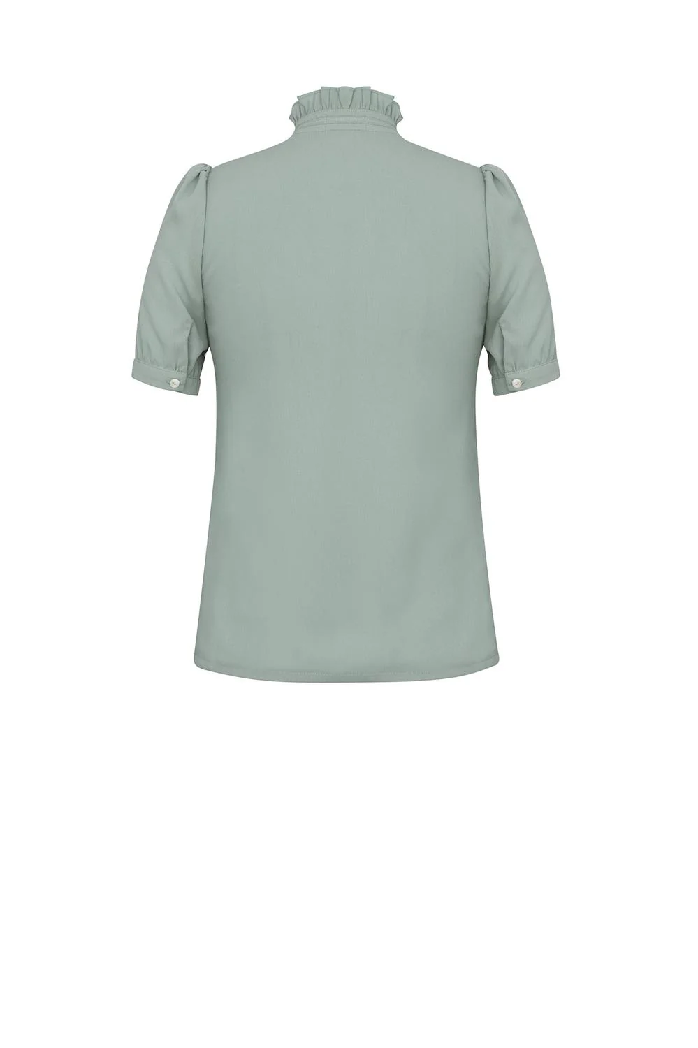 - Blusa con cuello mao, olanes decorativos, botonadura frontal, lazo decorativo y mangas cortas plisadas.