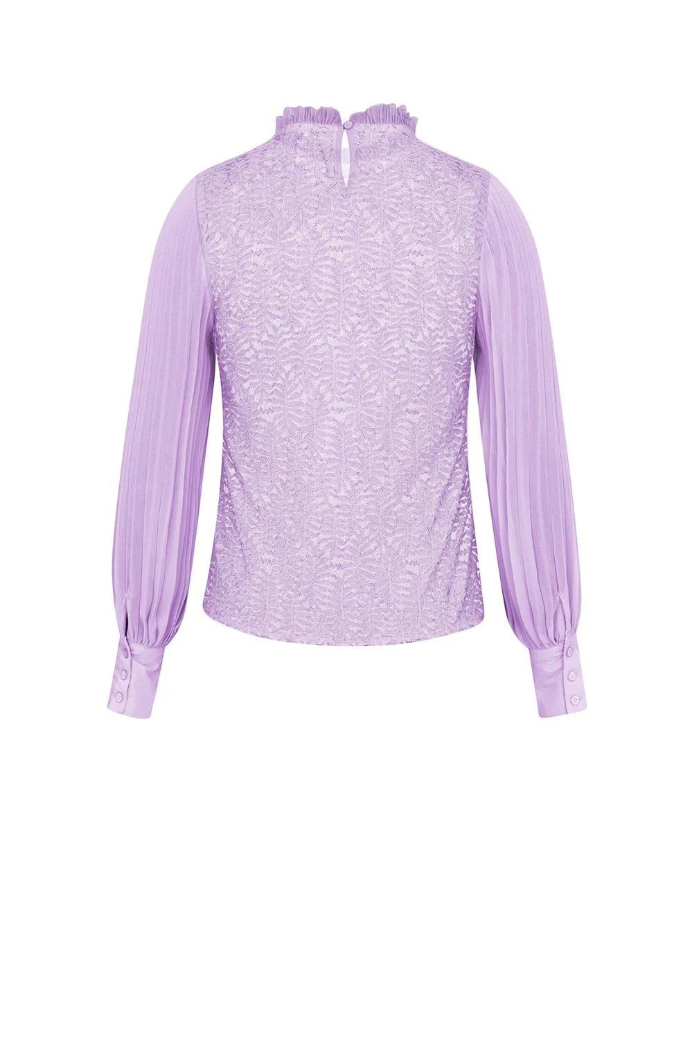 Blusa con olan en cuello, encaje en dorso, mangas largas con plisado cristal y puños anchos.
