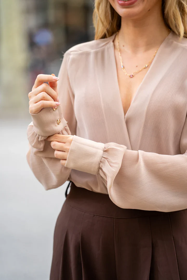 Body confeccionado en gasa suave con escote cruzado en V, mangas abullonadas con puños dorados y parte inferior en lycra negra.