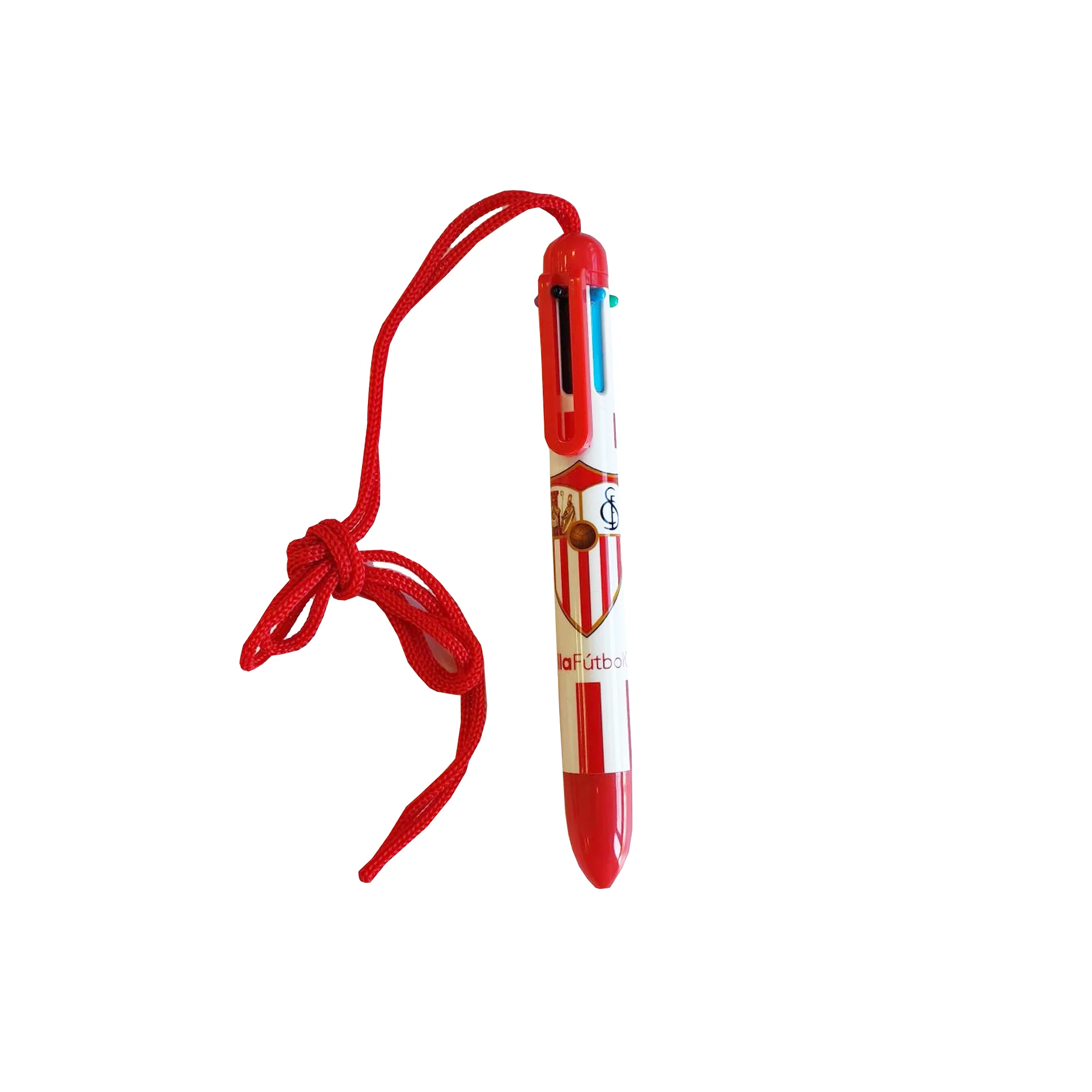 Bolígrafo 6 en 1 del Sevilla FC: Diseño retráctil de resorte lo que permite cambiar al color que quieras. Colores: azul, negro, rojo, amarillo,verde y morado. Trazado de líneas suave y sólido. Bolígrafo de punta media 0,5 mm con un trazo de escritura muy ligero. Dispone de una cuerda para llevar colgado