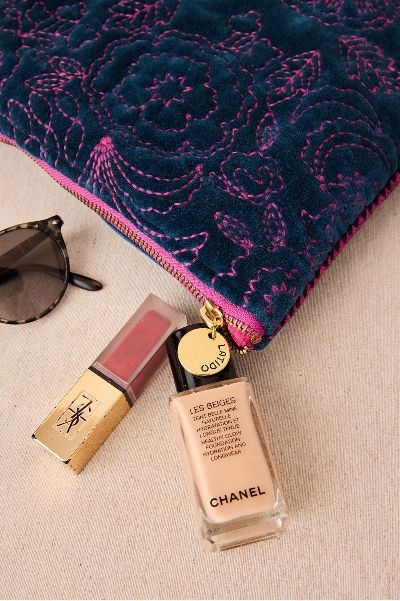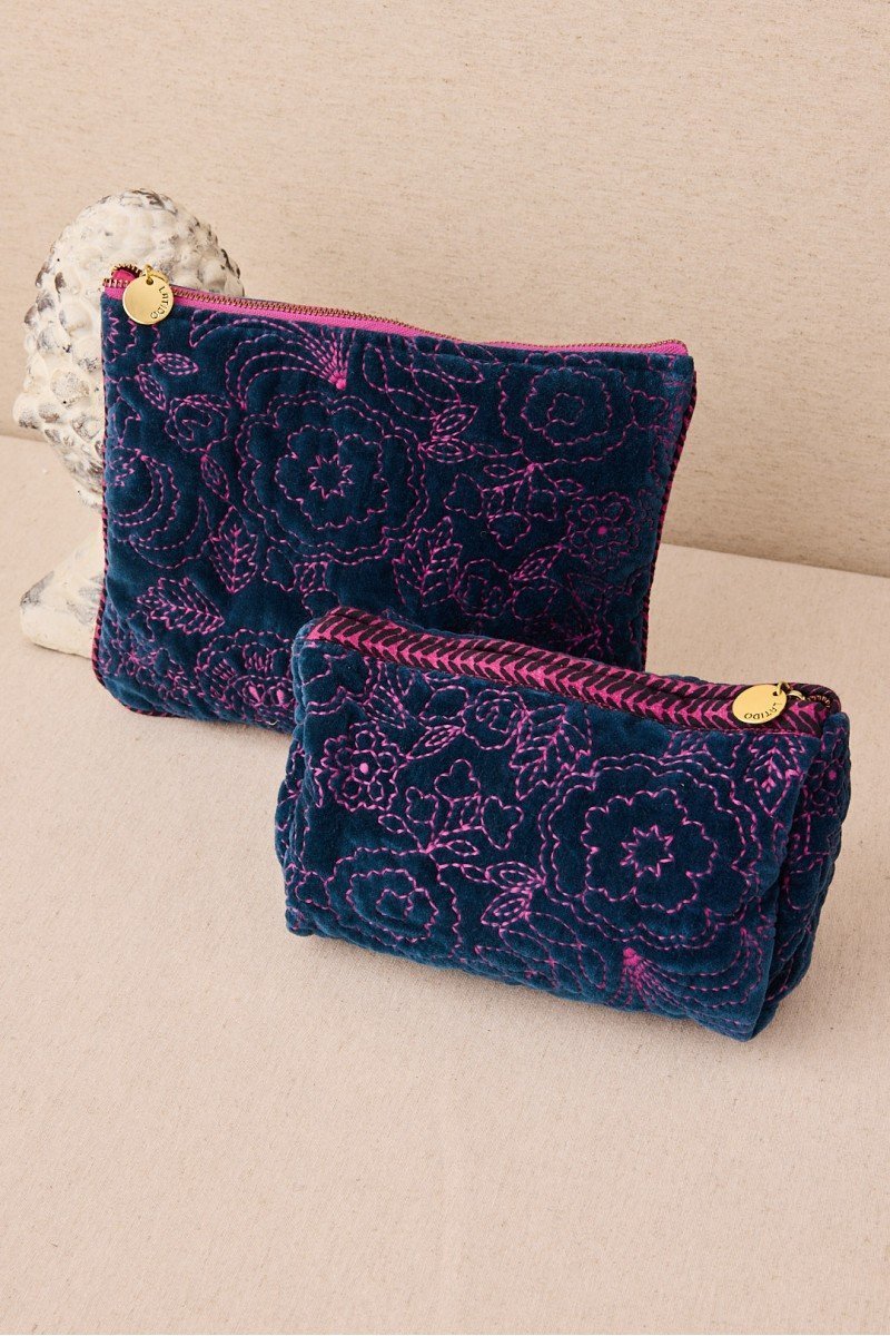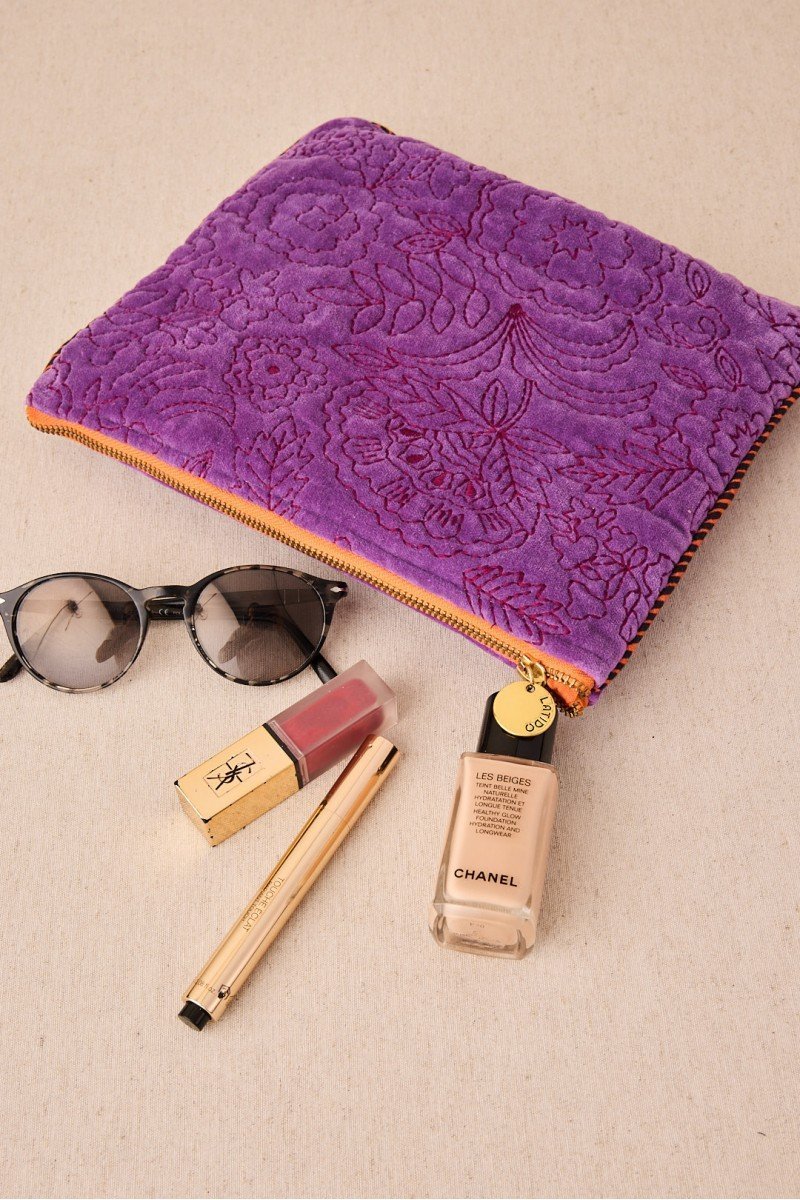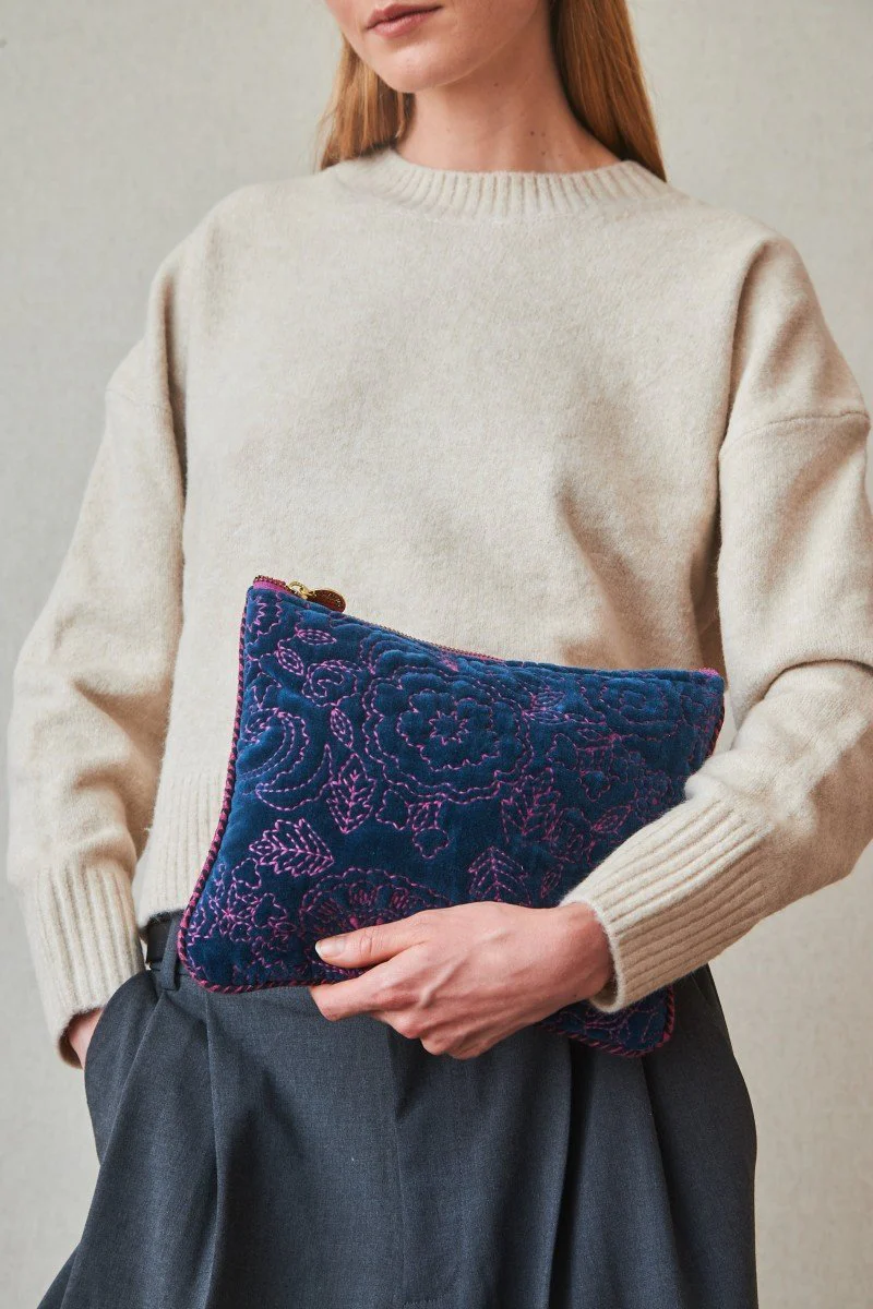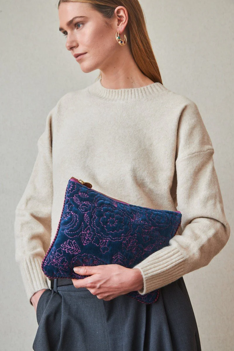 Bolsita de terciopelo en tamaño grande con diseño de rayas multicolor y cierre con borla. Decorada con bordados de hilos en contraste, es ideal para llevar lo imprescindible con un toque alegre y sofisticado.