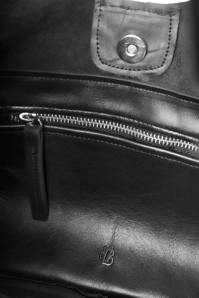Posee bolsillo interno de piel con cierre metálico YKK y logo de marca.
