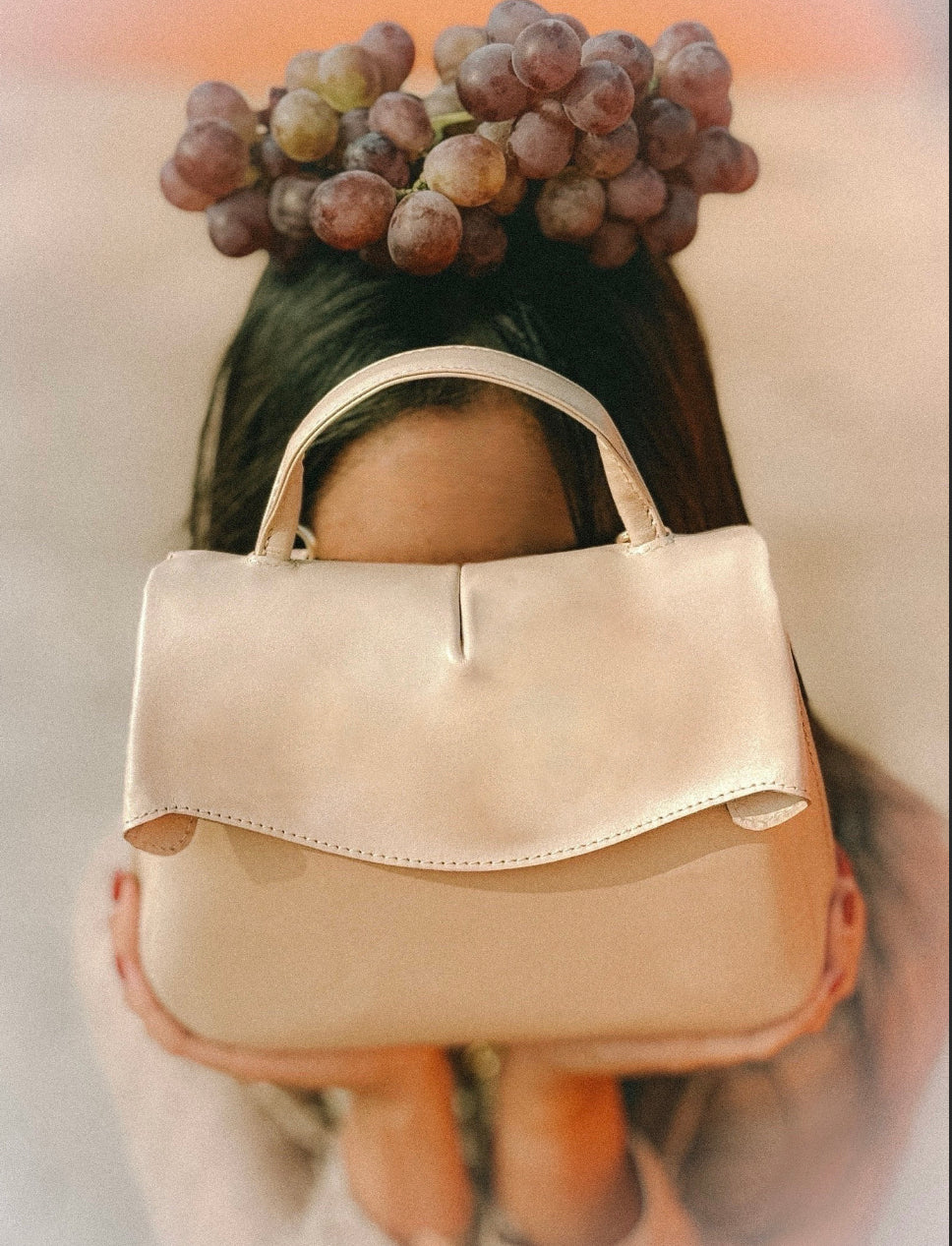 Confeccionada en cuero de tono crema, su diseño minimalista se eleva gracias a una solapa ondulada que recuerda el movimiento natural de una tela al viento. Un pequeño pliegue vertical al centro aporta sutil carácter y rompe la simetría con elegancia.
