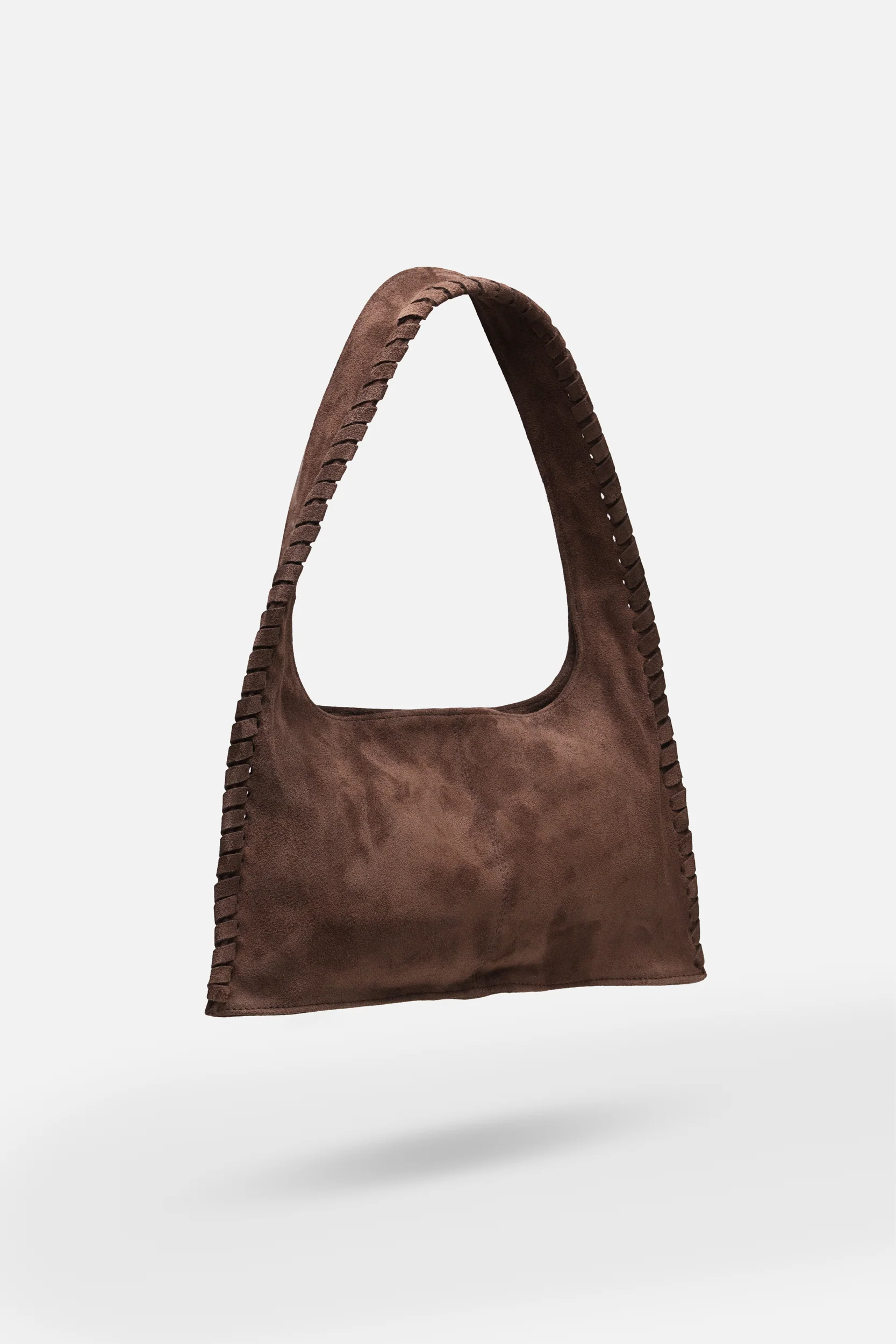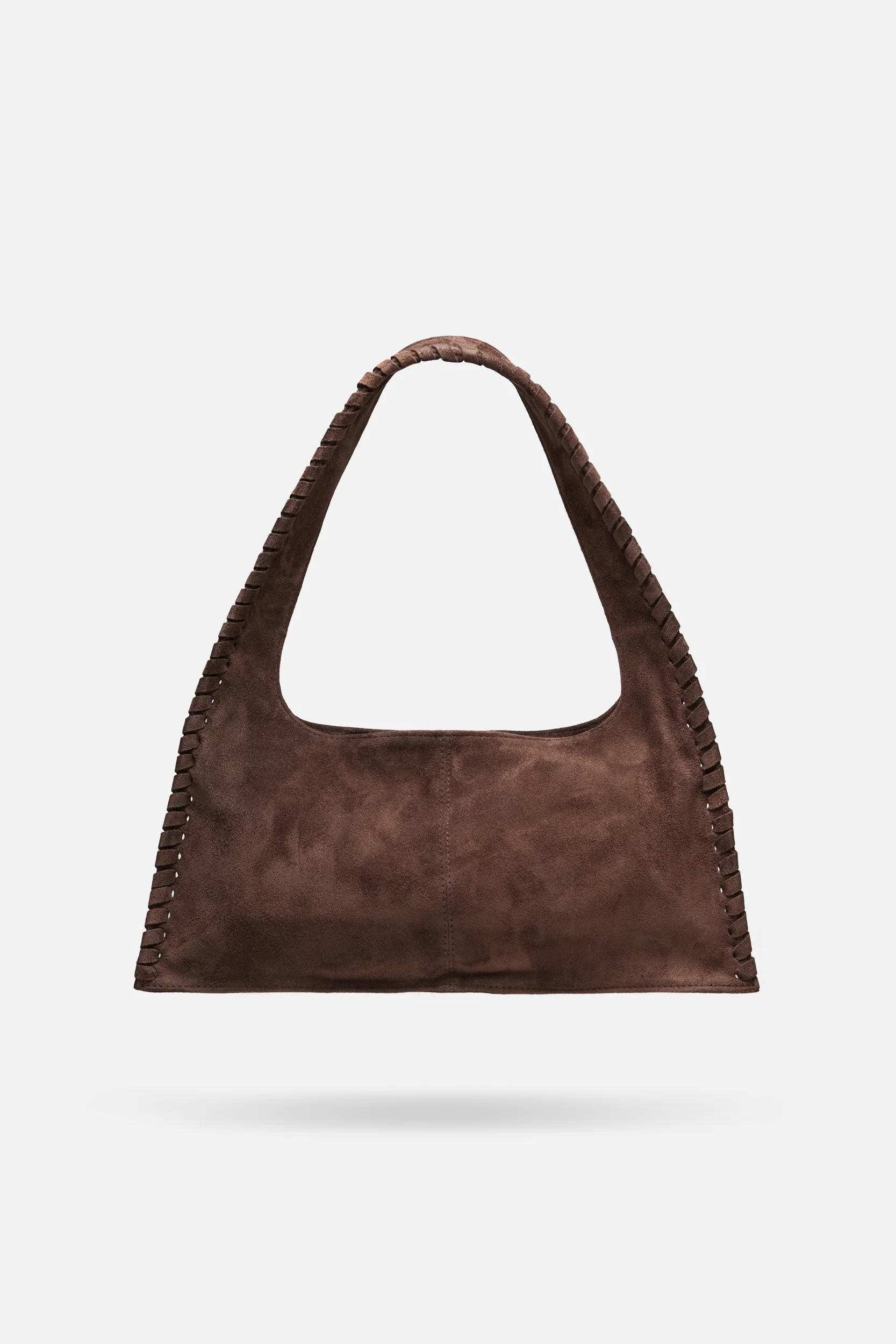 Está hecha en cuero vacuno gamuzado con detalles trenzados en sus bordes.