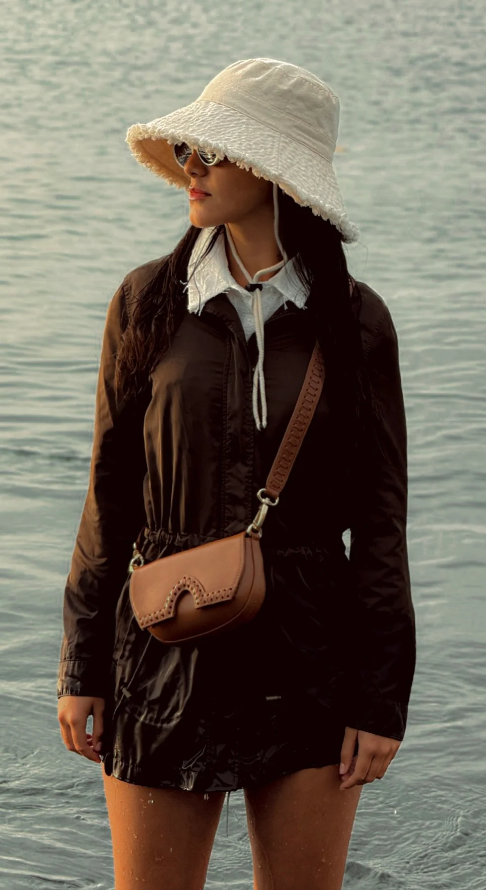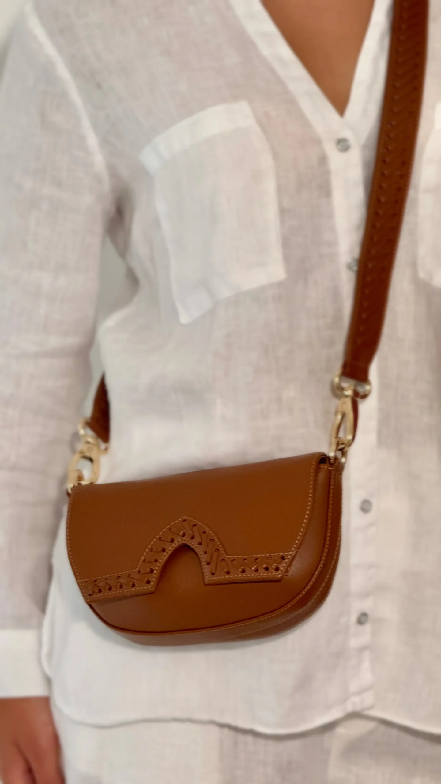 El asa, removible o ajustable, repite el mismo pespunte artesanal, creando una armonía visual en todo el diseño. El cierre es magnético, lo que refuerza su estética