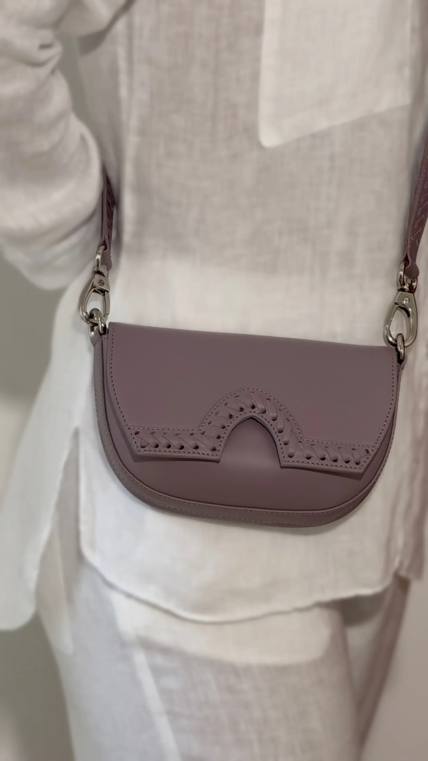 Este elegante bolso presenta una silueta estructurada de líneas suaves y curvas. Confeccionado en cuero liso color malva, su tapa destaca por un detalle central en relieve con pespuntes decorativos que aportan carácter y originalidad.