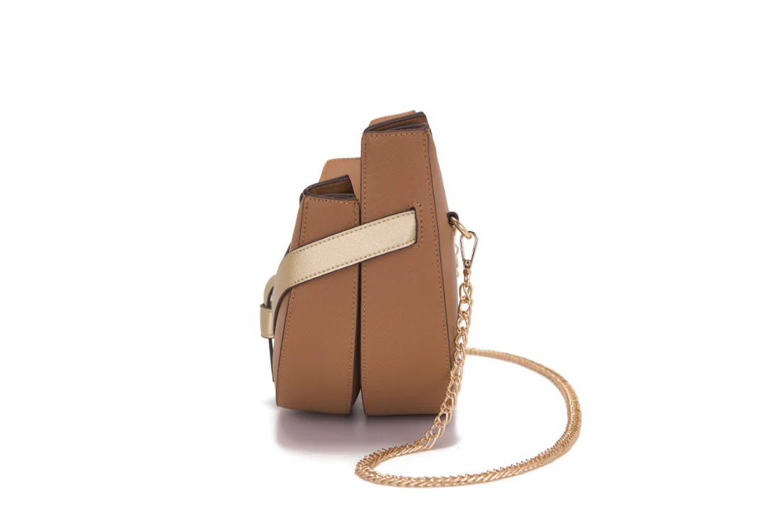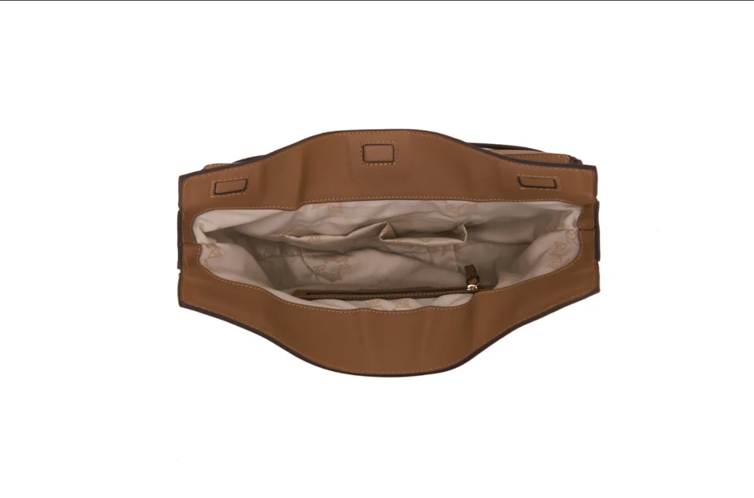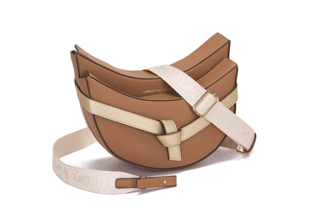 Toffee, color cuero con detalle en oro. Disponible en 2 colores. (Toffee y Nighty). Material reciclado procedentes de botellas plásticas. Caja cartón embalaje, saco protector MR y forro interior del bolso de materiales reciclados.