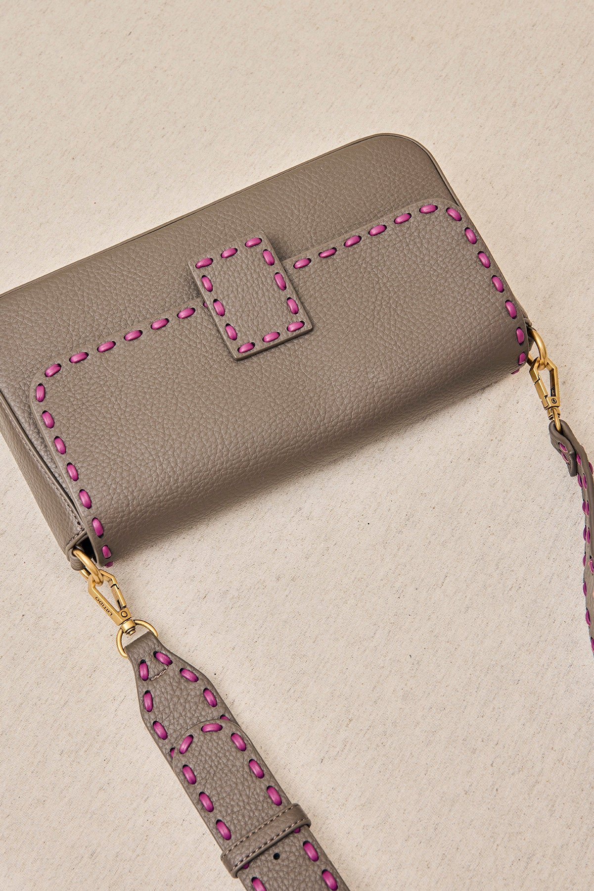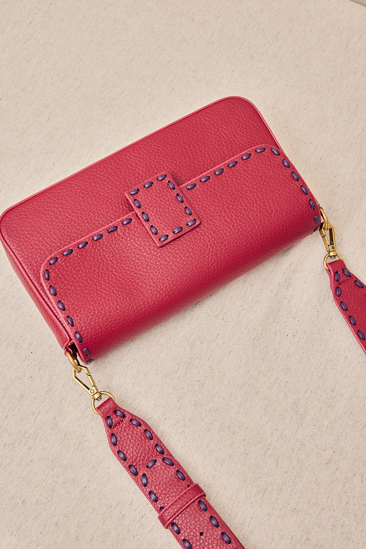 Bolso urbano de formato alargado con textura granulada y detalle de costuras decorativas en contraste. Incluye bandolera extraíble con herrajes metálicos que combina funcionalidad y estilo.