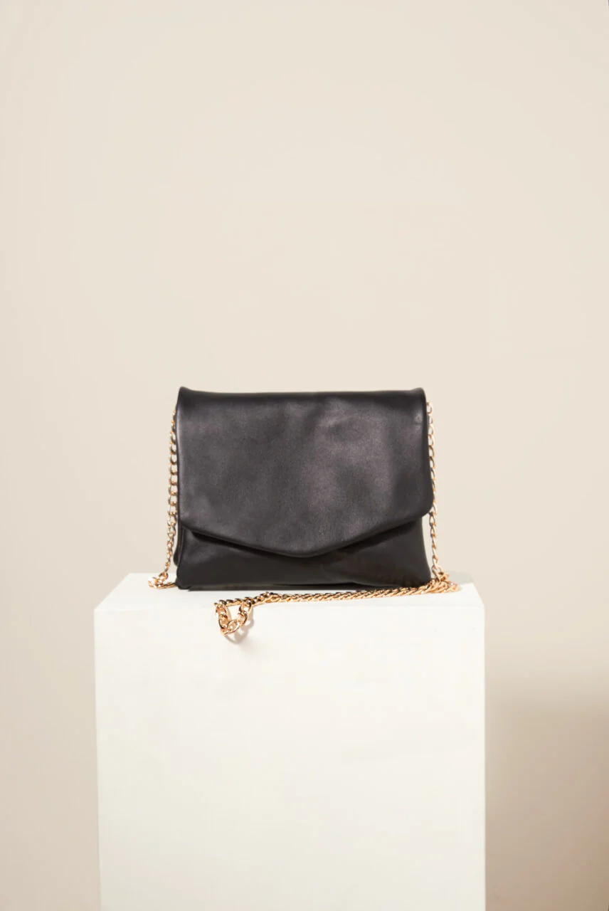 Esta elegante bandolera de cuero vacuno liso es perfecta para quienes buscan un accesorio versátil y sofisticado. Cuenta con tres divisiones internas que permiten organizar tus pertenencias de manera práctica. Su cadena dorada para colgar se puede guardar en el interior, transformándola fácilmente en un sobre para un look más chic. Cierra con un práctico imán para mantener todo seguro. El interior está forrado en lienzo al tono, y los herrajes y la cadena tienen un acabado dorado que le da un toque de lujo.