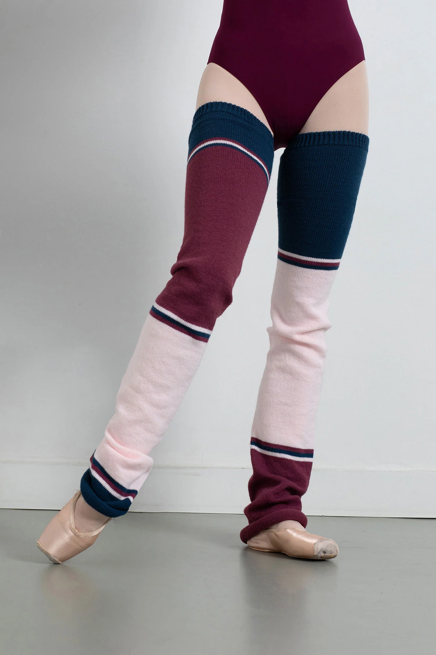 Calentador clásico rayados en tres tonos combinados de piernas enteros. Perfectos para tus ejercicios de calentamiento. Ideales para no pasar frío en tus clases de danza y para mantener tus músculos calientes y evitar lesiones.