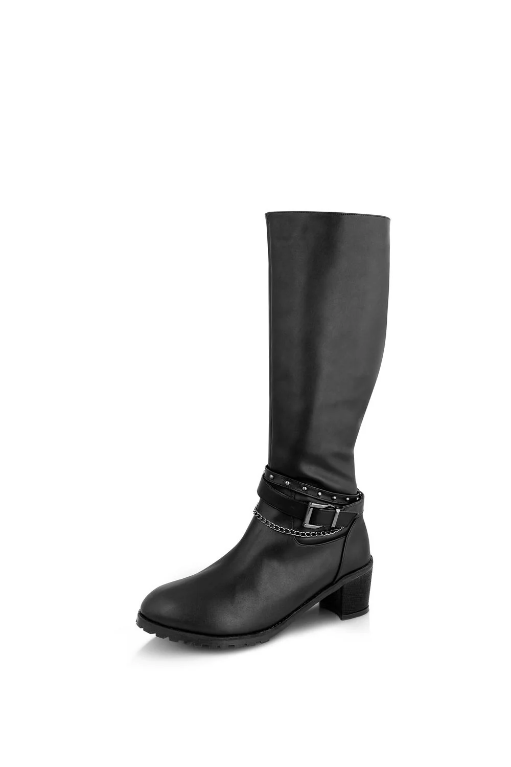 - Bota con tacón cuadrado, cierre en costado, cintos decorativos con cadena y herrajes metálicos.