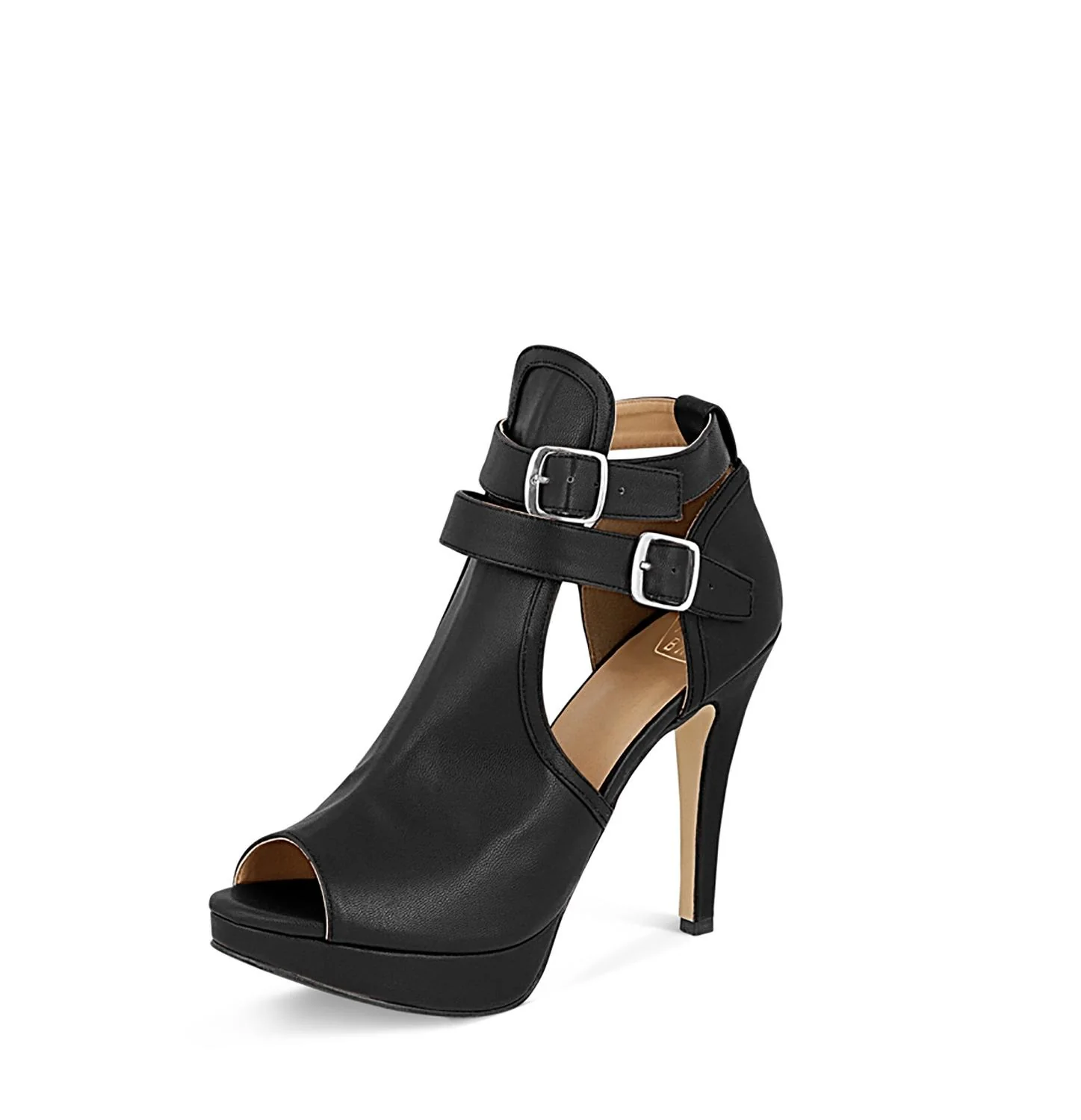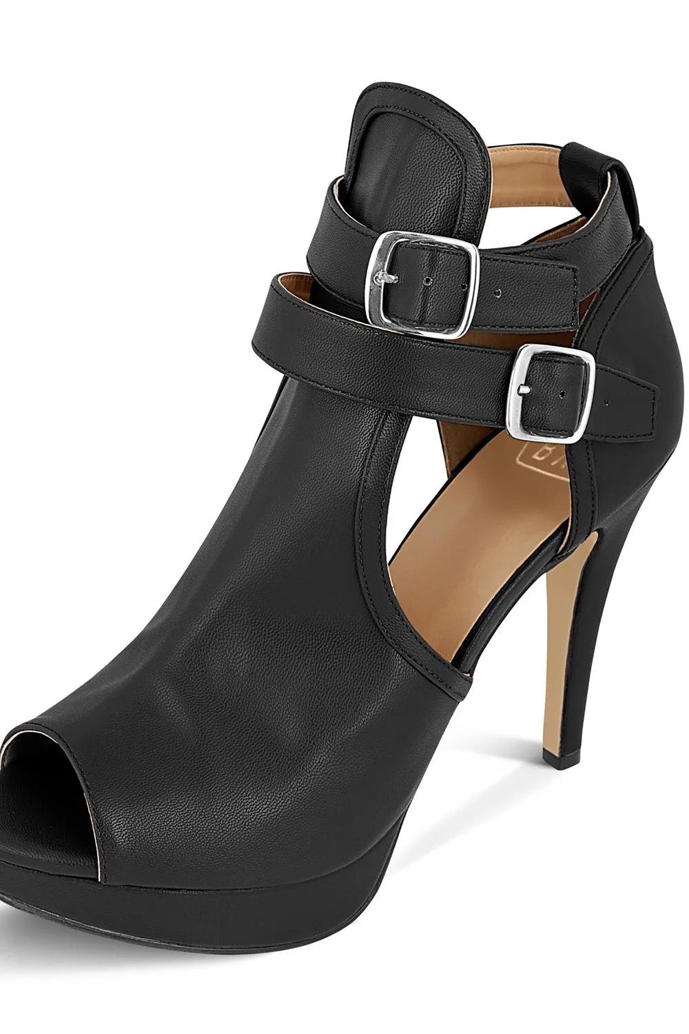 - Sandalia abotinada con media plataforma y peep toe en punta, acabado napa sintetico, ajuste con doble tira y hebilla en talon, suela en contraste beige.