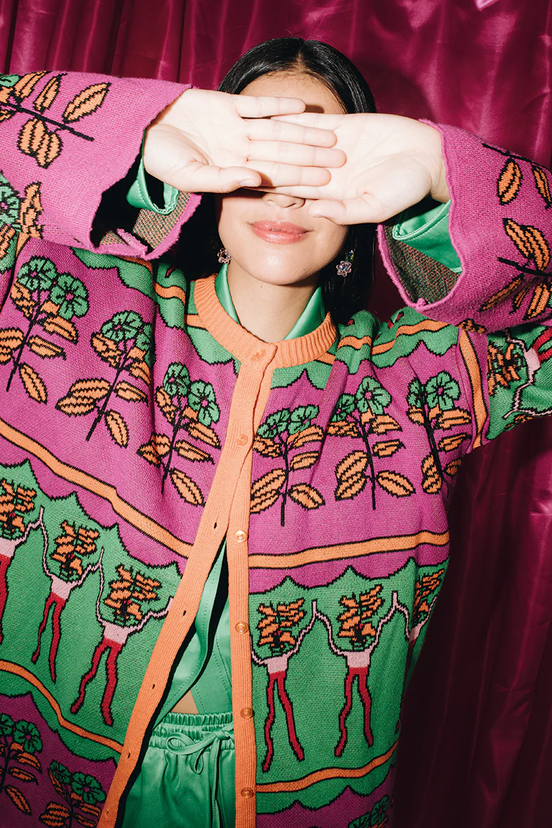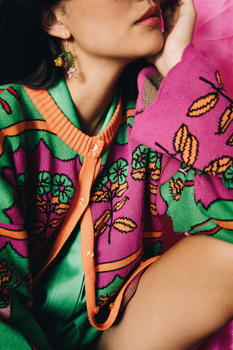 Long sleeve cardigan with 8 buons at the front with cuts on each side.