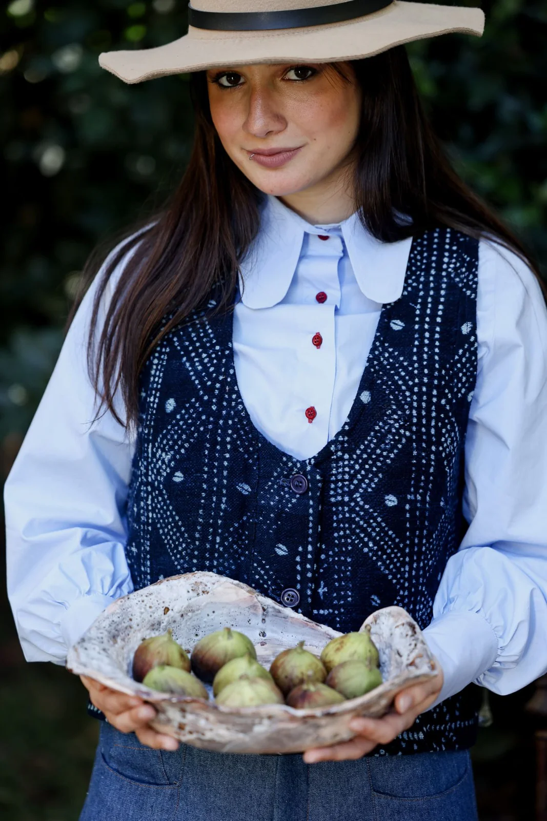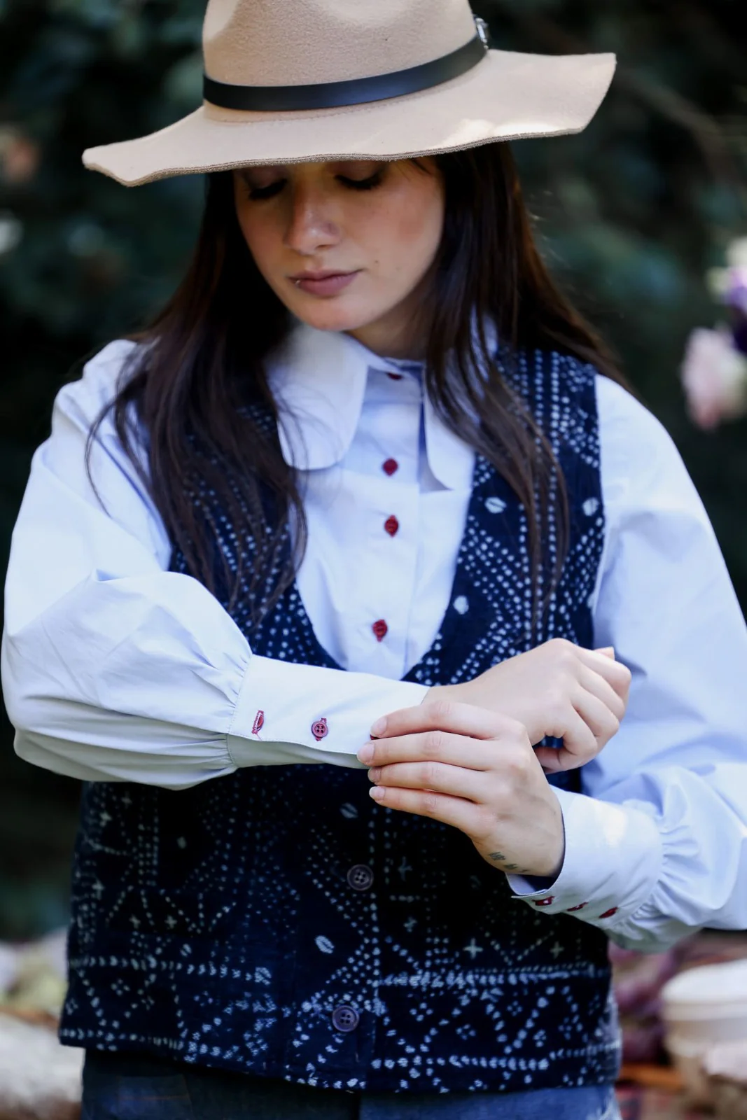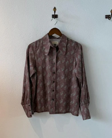 Camisa Agus, puños anchos, cuello grande redondeado, talle holgado.