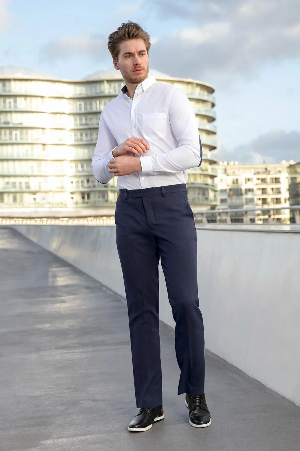 Camisa slim fit con mangas largas bolsillo al frente, contrastes en puños y coderas. Composición: 60% Poliéster 40% Algodón prod. # 19-1051