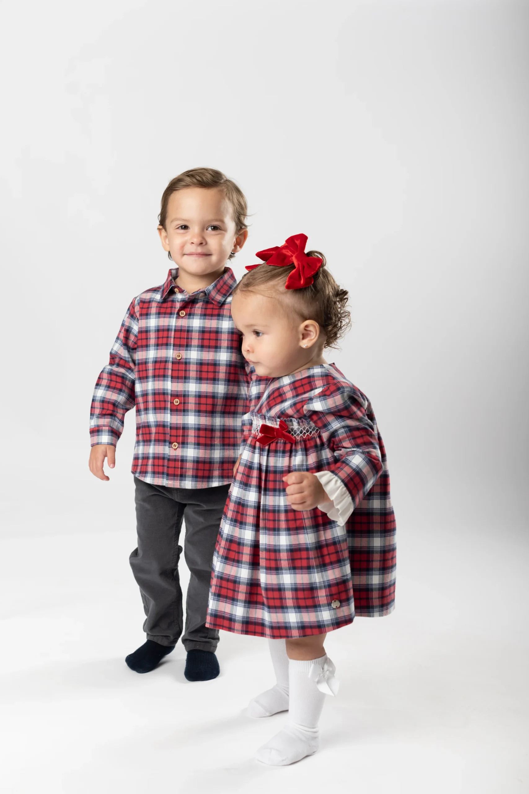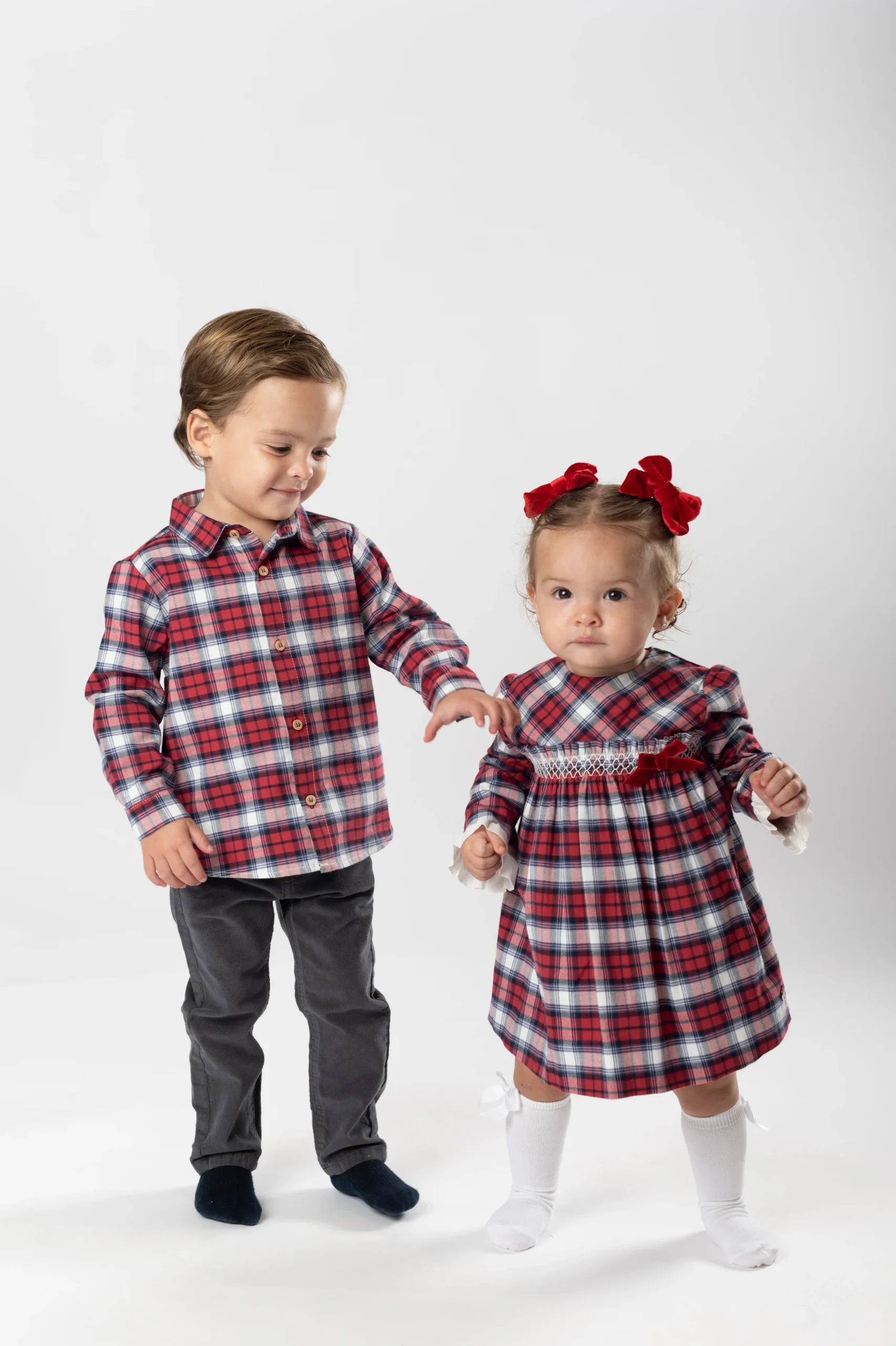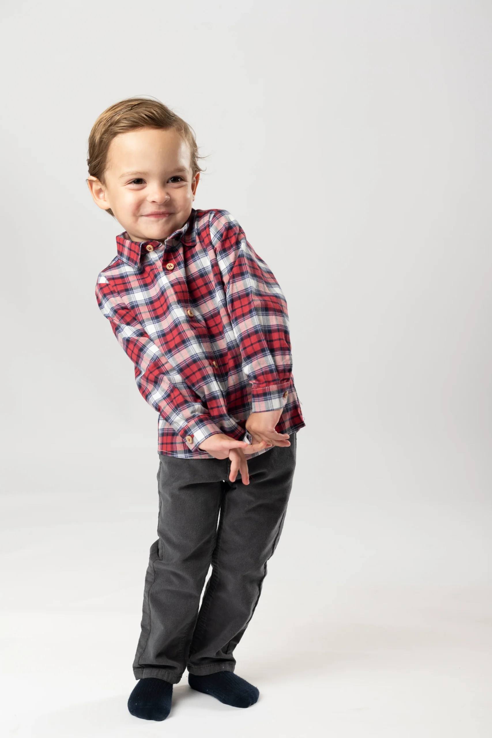 ¡Hermosa y elegante camisa de cuadros!¡Ideal para esta epoca navideña! Camisa de cuello camisero, manga larga para niño con trabilla y botón en el lateral para poder recogerla y ajustar el largo y cierre con botones en la parte delantera.