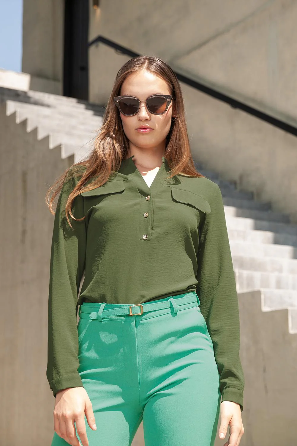 - Camisa con escote redondo, abertura frontal, simulación de bolsillos, botonadura y mangas largas.