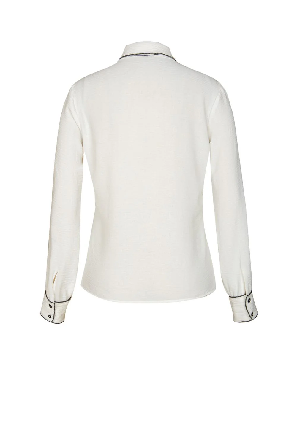 - Camisa con cuello camisero, lazo decorativo, botonadura frontal, mangas largas con puños y sobrehilado decorativo a contraste.