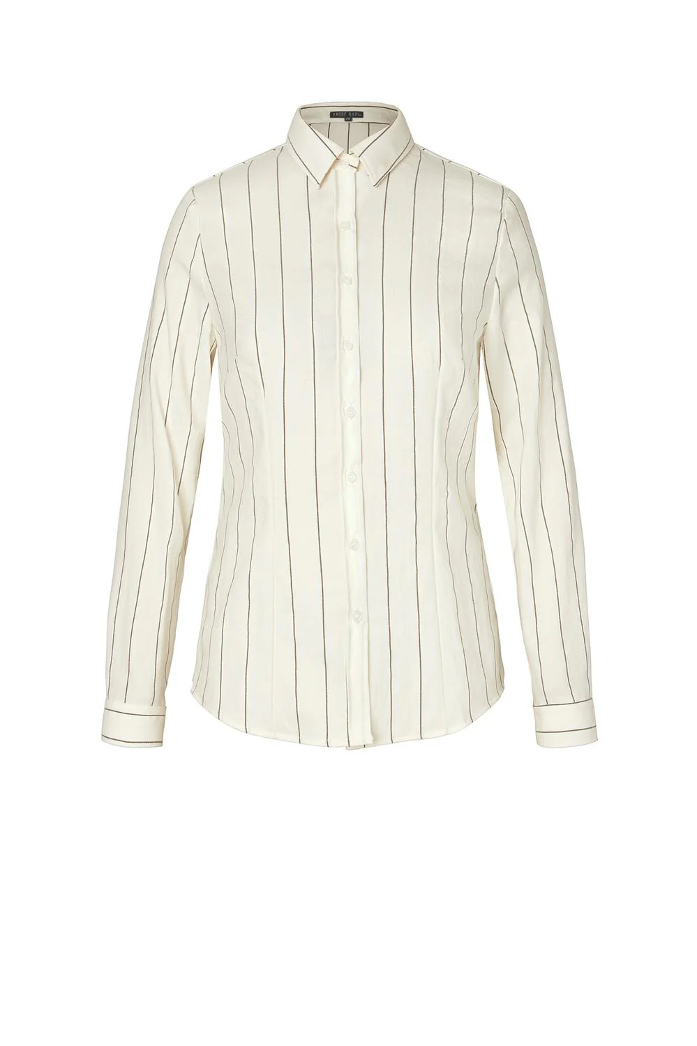 Camisa a rayas con cuello camisero, botonadura frontal, pinzas a la altura de cintura, mangas largas y puños con líneas en orientación a contraste.