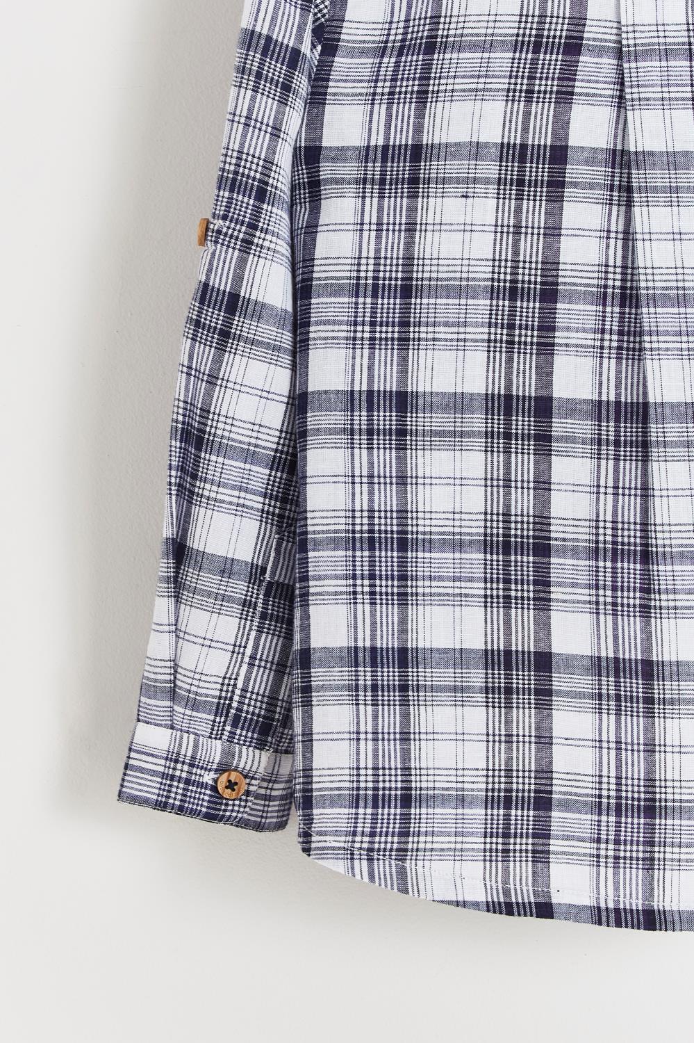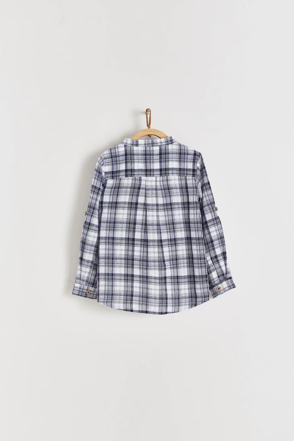 ¡Elegante y fresca camisa de botones! ¡Ideal para días de calor! Camisa de estampado de cuadros, manga corta, cuello mao y botones y bolsillo frontales.