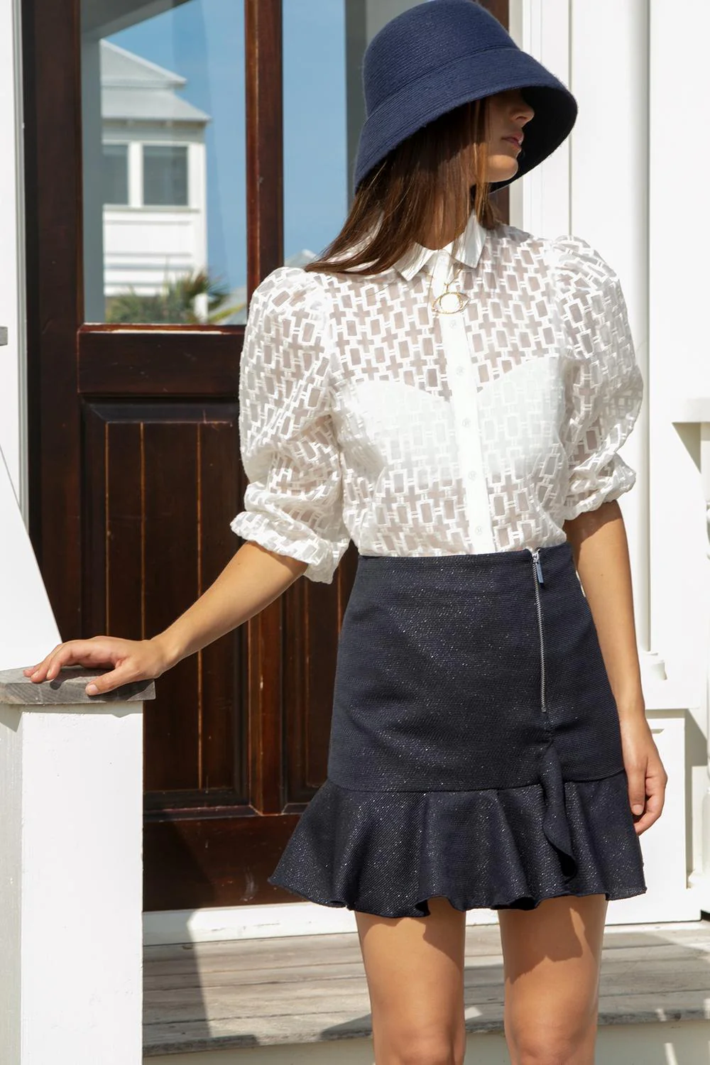 Camisa con textura y transparencia, cuello camisero, mangas abullonadas y elástico en puños. Composición: 100% Poliéster prod. # 19-1152