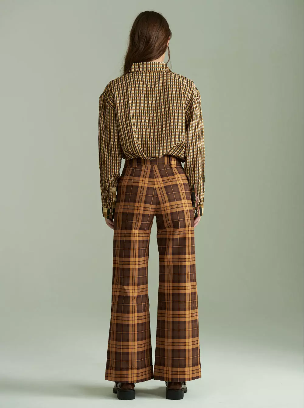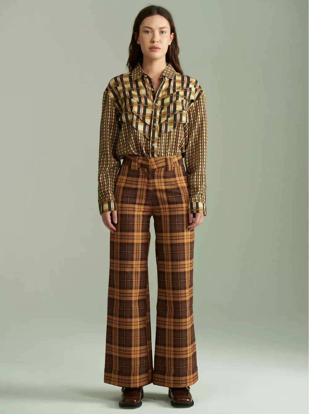 La camisa Lindada es la camisa de la temporada. Tonos sutiles, diseño único inspirado en el cuadrillé setentero con un toque country: en la parte superior, vuelos tipo mini capas de tela que caen una sobre la otra. La estampa de los vuelos hace juego con la de los puños. Los botones plateados y grandes son una pieza fundamental del diseño, que potencian la vibra retro.