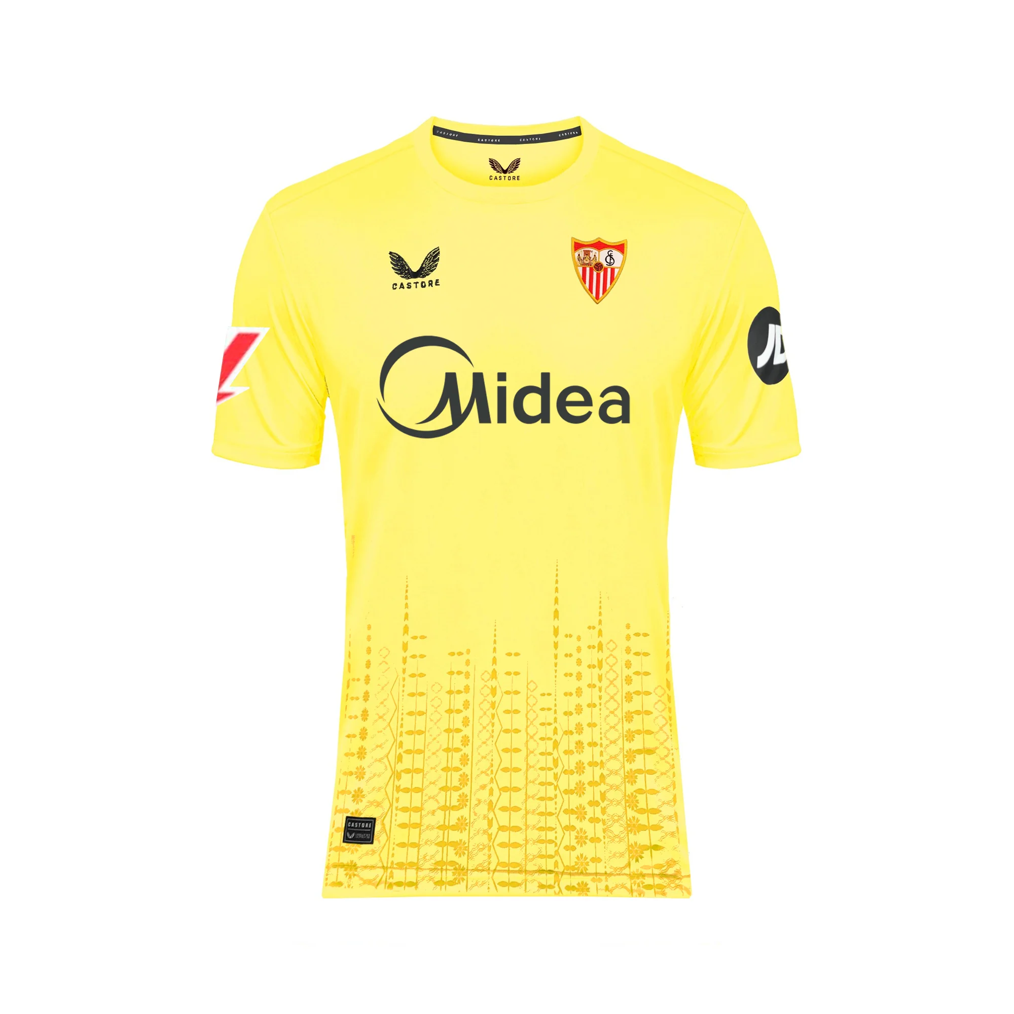 De manga corta y en amarillo, con el logo del sponsor técnico en blanco y el escudo del Sevilla Fútbol Club bordado a todo color sobre el corazón, así es la Camiseta Oficial de la Tercera Equipación de Portero del Sevilla FC para Adultos para la temporada 24/25.