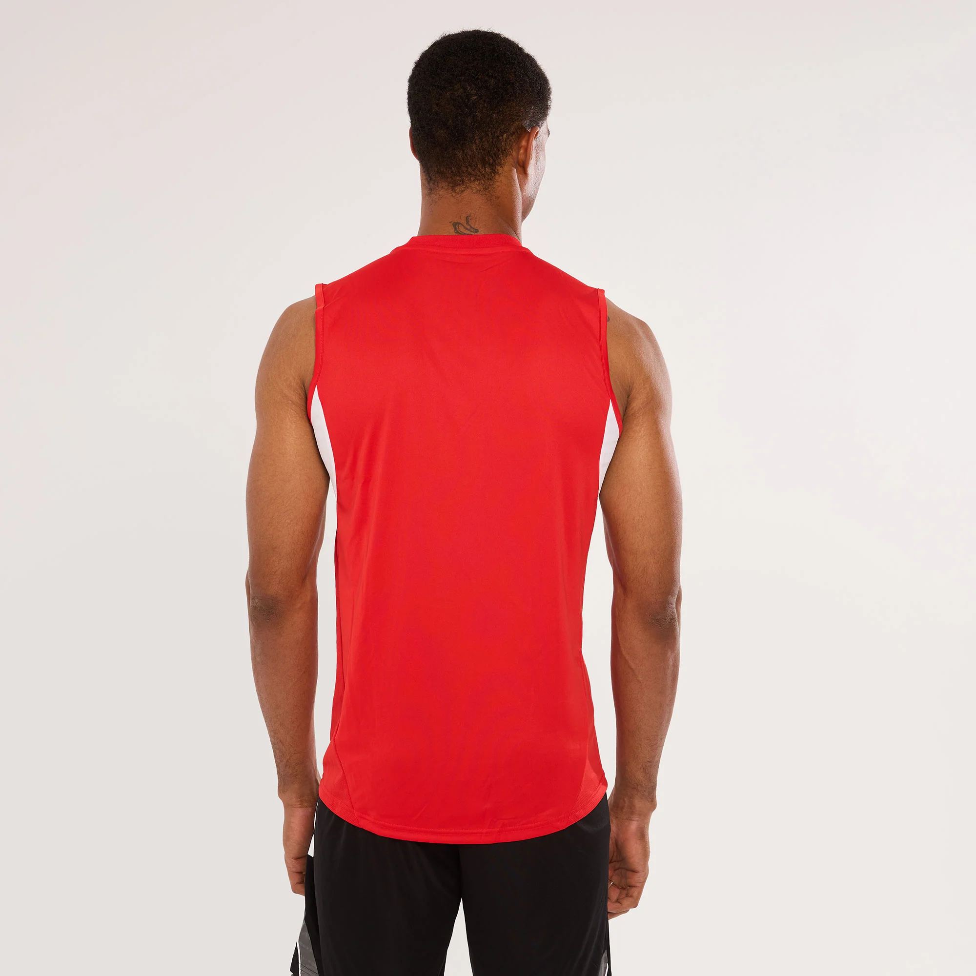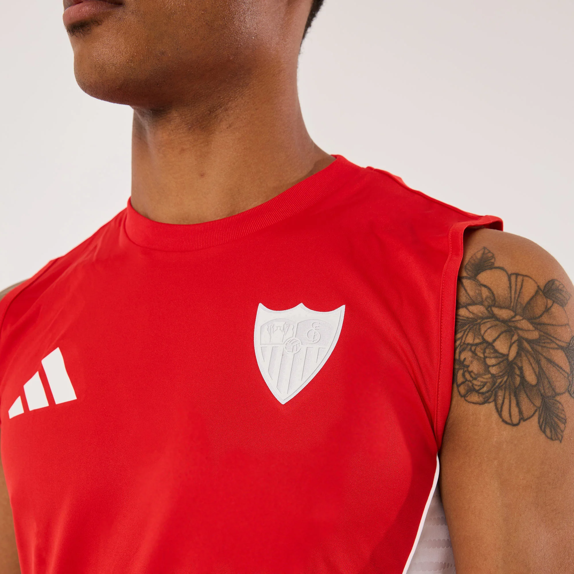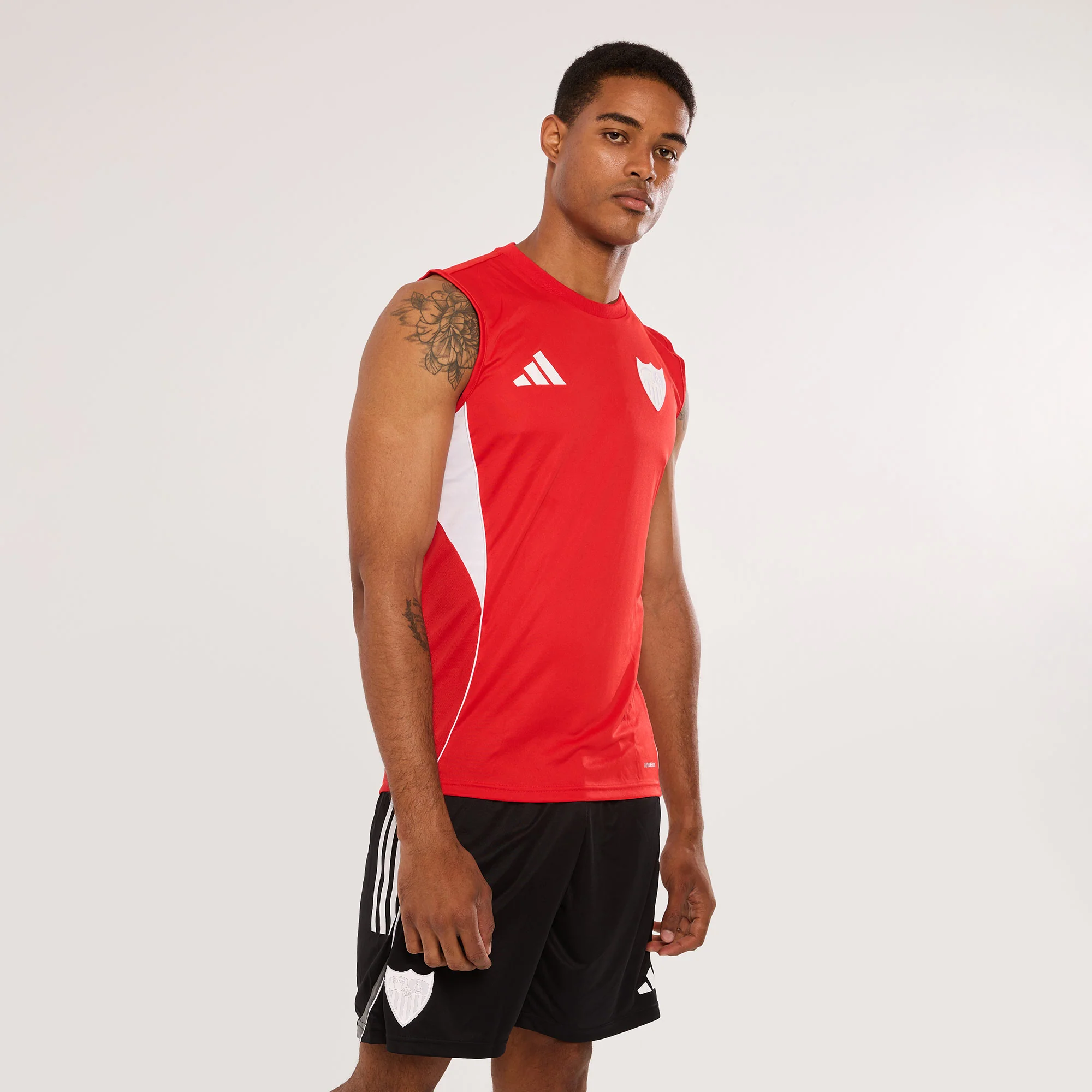 La camiseta sin mangas para adultos oficial en color rojo y el escudo del Sevilla Fútbol Club serigrafiado en blanco que lucirán los jugadores del equipo en sus entrenamientos durante la temporada 25/26.