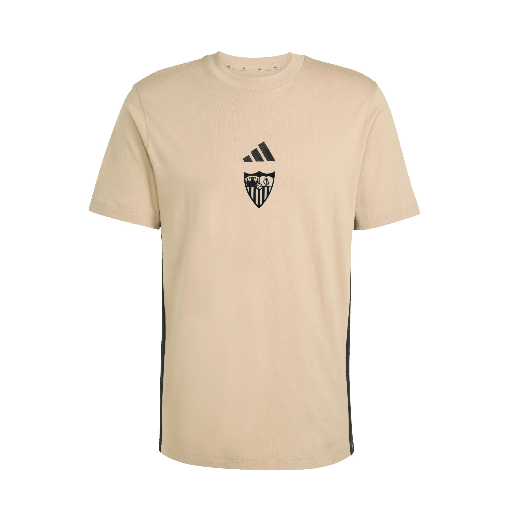 La camiseta imprescindible para adultos de la Colección Oficial de Moda Casual del Sevilla Fútbol Club para la temporada 25/26, en beige con el logo del sponsor técnico y el nombre de tu equipo serigrafiados en color negro en el pecho. Perfecta para cualquier ocasión.