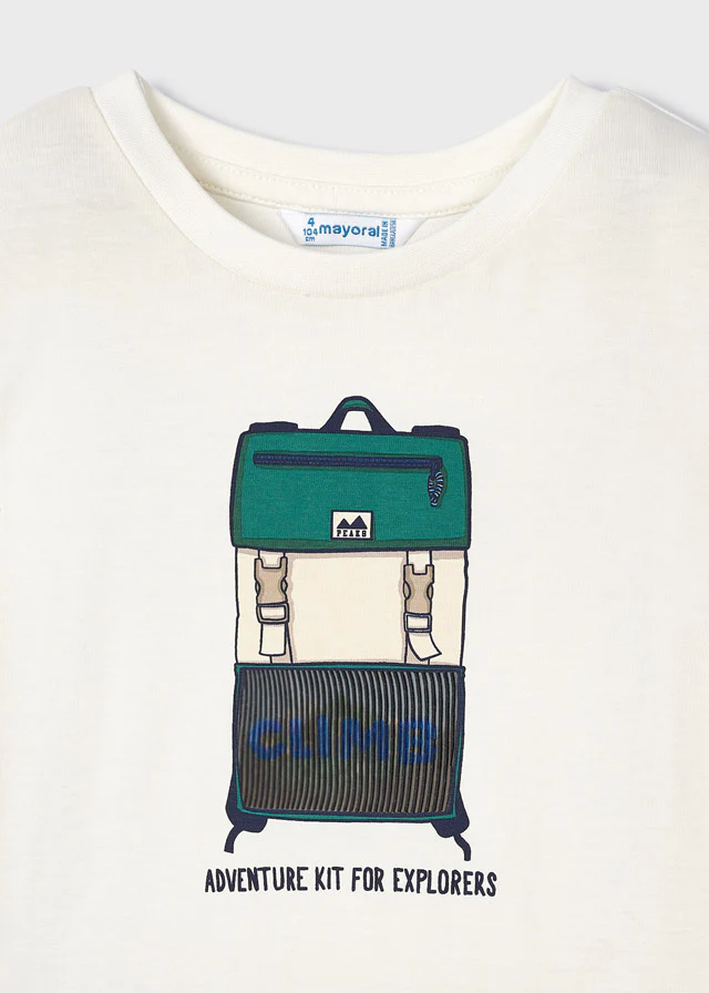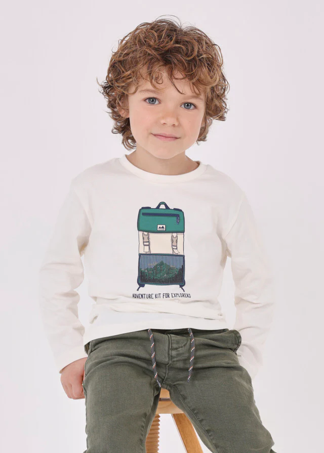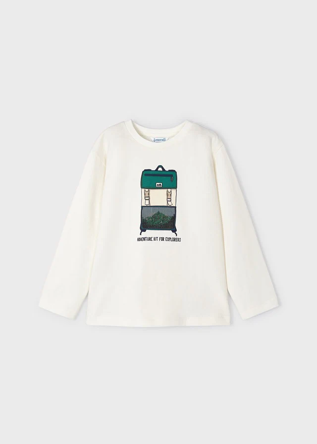 Básica playera con impresión lenticular de una mochila! ¡Los niños no querrán quitársela! De manga larga, cuello redondo y cuadrado en el pecho con la impresión lenticular.