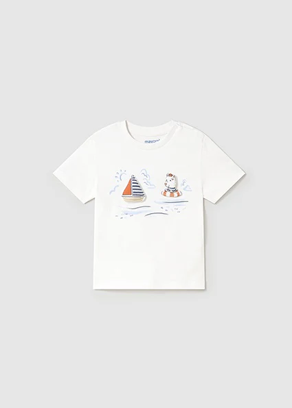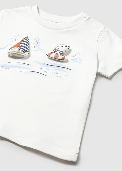 ¡Básica playera con dibujo con aplicaciónes! ¡Los niños no querrán quitársela! De manga corta, cuello redondo y dibujo en el pecho con aplicaciónes bordadas que sobresalen de la playera.