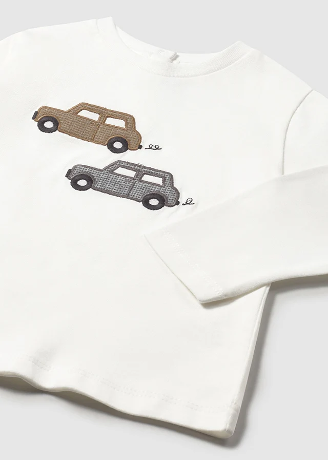¡Padrisima playera con dibujo de carritos bordados! ¡Los niños no querrán quitársela! De cuello redondo, manga larga y cierre de botones a presión de lado para facilitar su puesta.