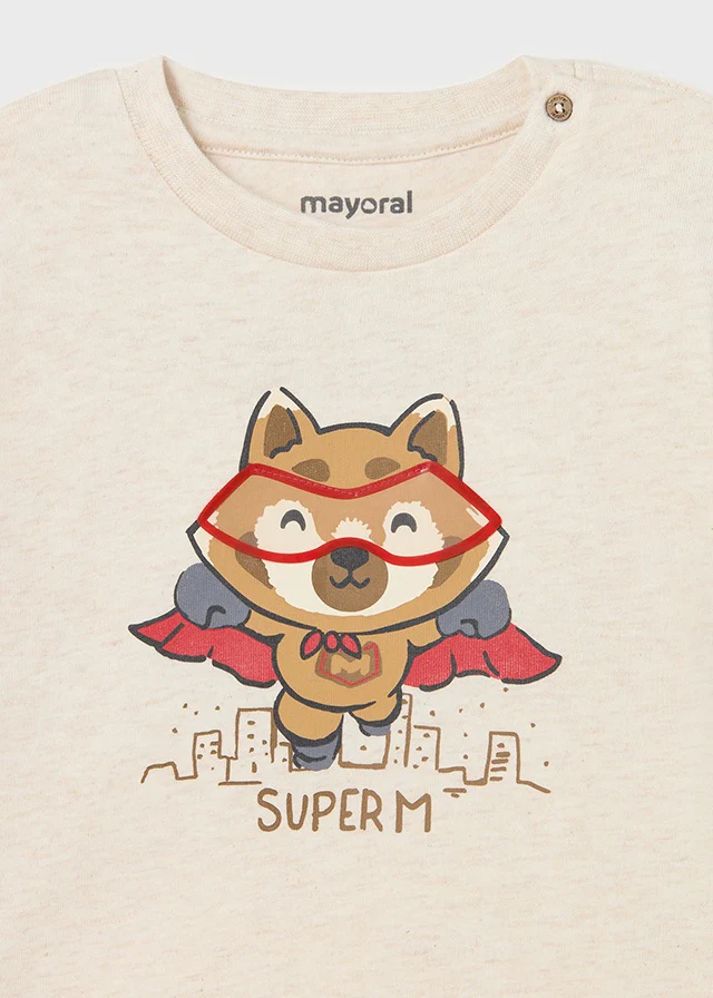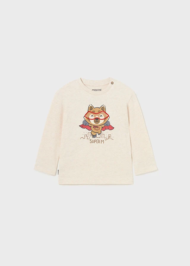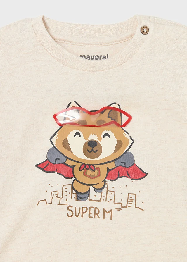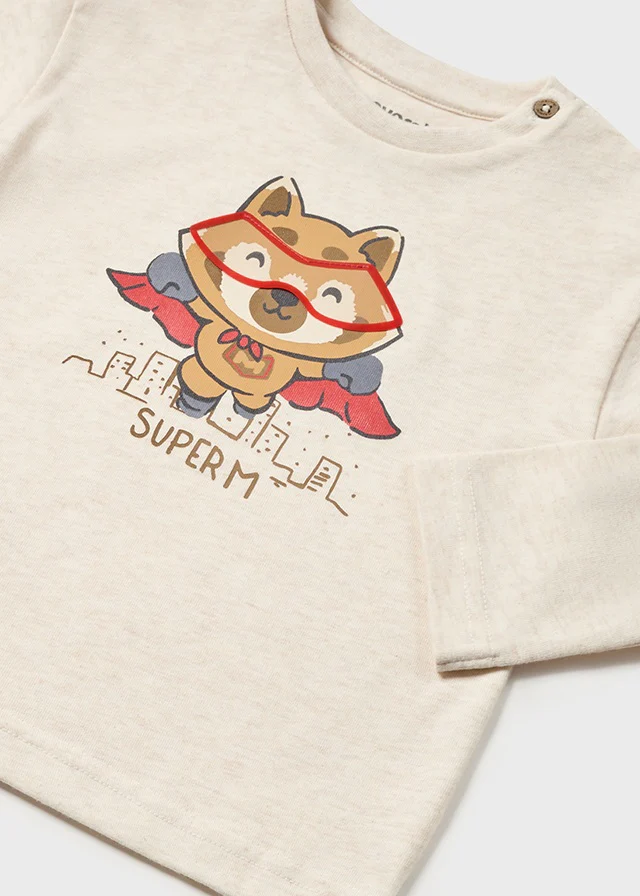 ¡Padrisima camiseta interactiva! ¡Los niños no querrán quitársela! De cuello redondo, manga larga, cierre de boton por el hombro para facilitar su puesta y dibujo estampado de super heroe con antifaz movible.