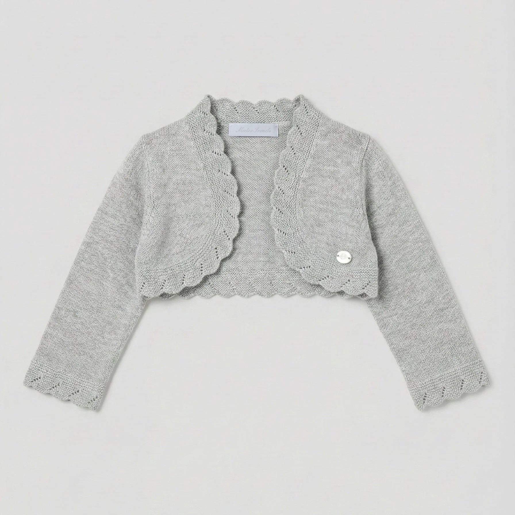 ¡Elegante y divino torerito con motivos calados unicos! De cuello redondo, manga larga, diseño corto de tipo bolero, abierto en la parte delantera. Un «must-have» en el guardarropa de las niñas, ya que son prendas básicas y esenciales en su armario para completar cualquier look.