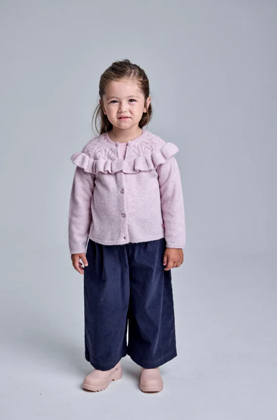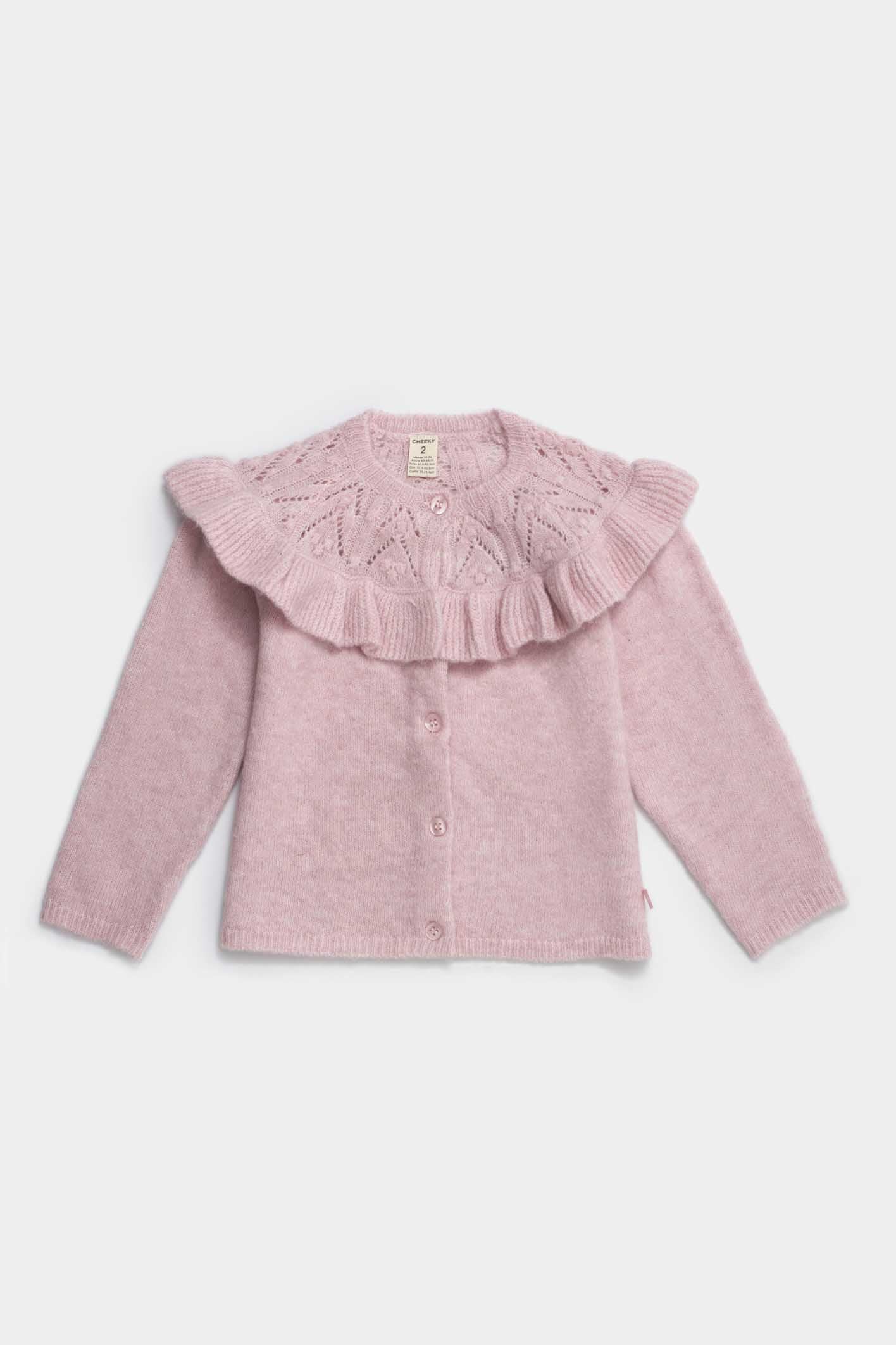 El Cardigan Rebeca está tejido con canesú calado y volado, cartera central con botones al tono y medalla de plástico con logo. Composición: 69% poliéster, 23% acrÃlico, 6% lana, 2% elastano.