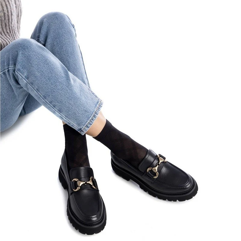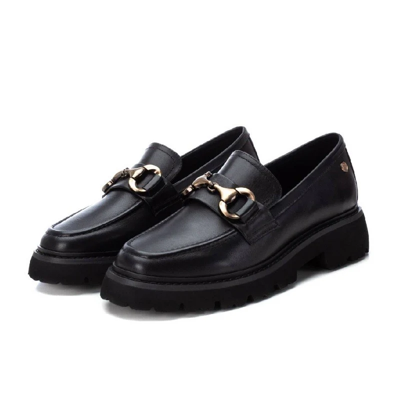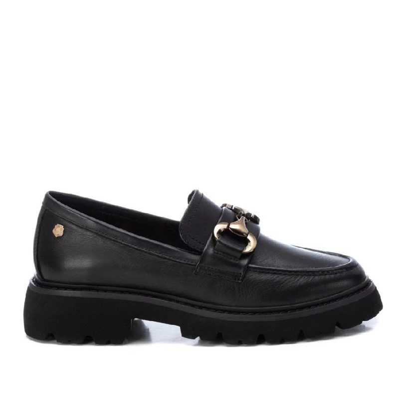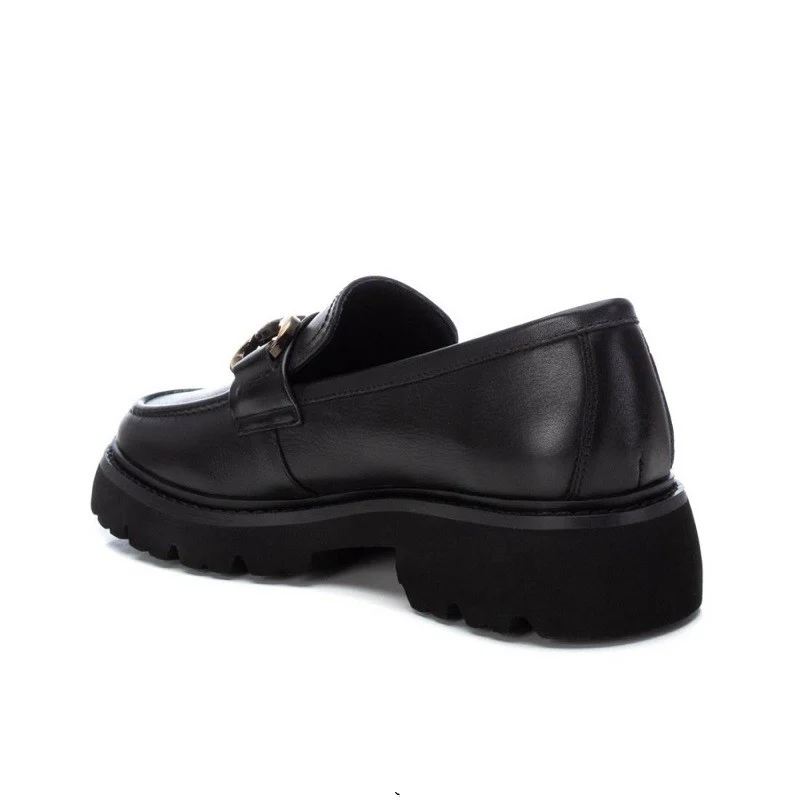 Mocasín de mujer, de la marca Carmela. Fabricado en piel de alta calidad. Detalle antifaz y cadena decorativa en el frente. Suela gruesa y antideslizante y cómoda planta.