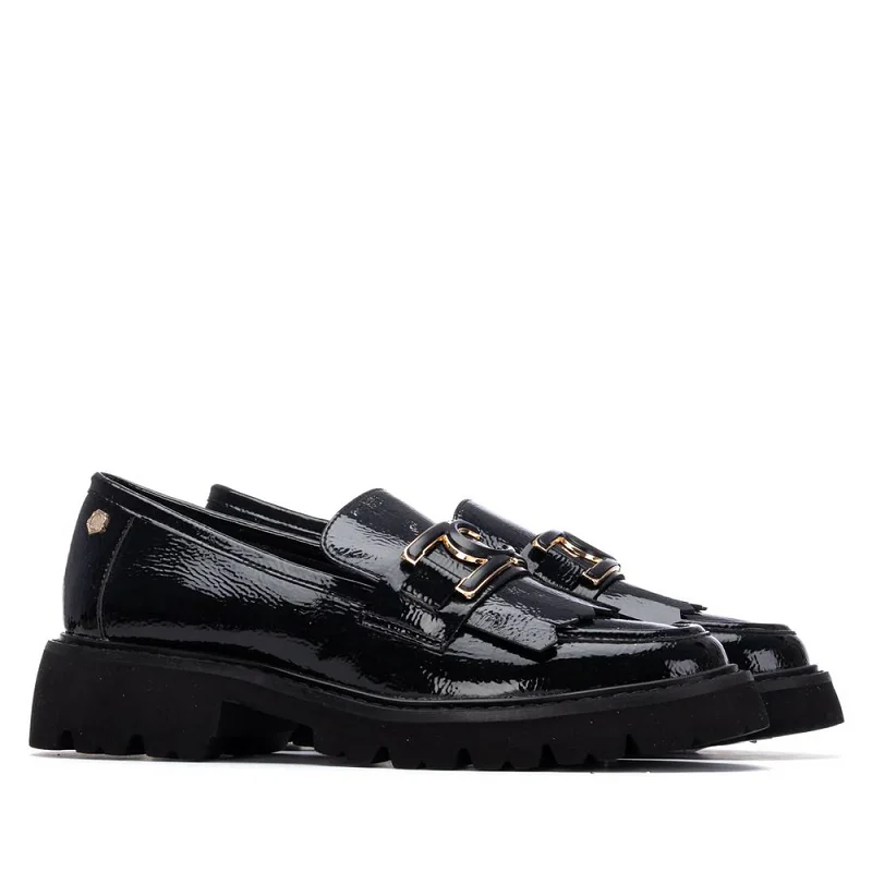 Este mocasín de mujer Carmela, fabricado en charol negro, destaca por su elegante antifaz decorado y flecos, que aportan un toque sofisticado y moderno. Su suela gruesa de goma antideslizante garantiza seguridad y comodidad en cada paso, ideal para el uso diario con estilo y confianza.
