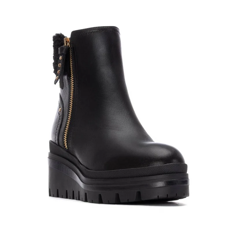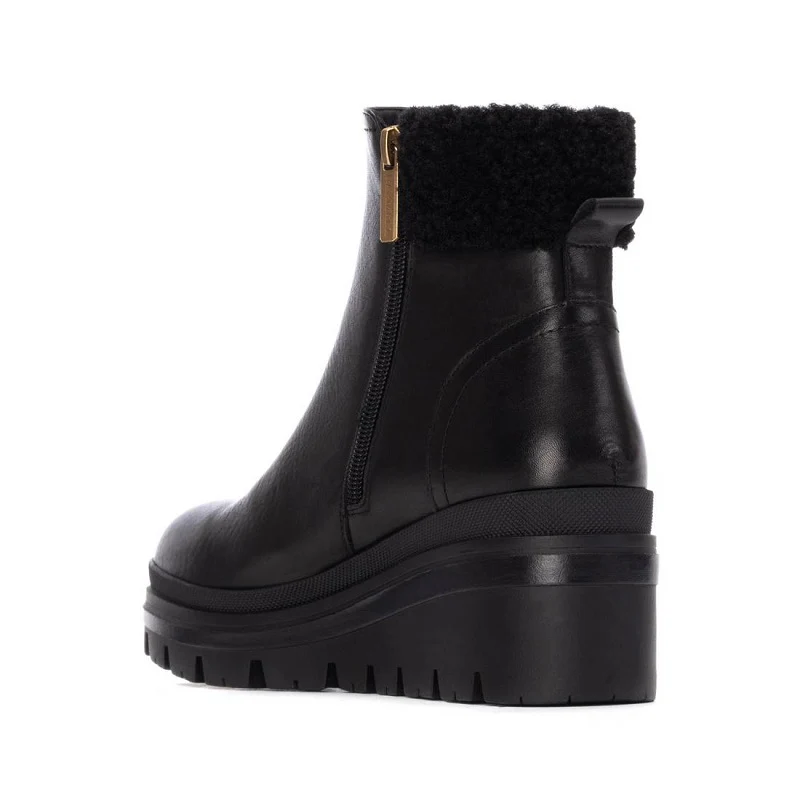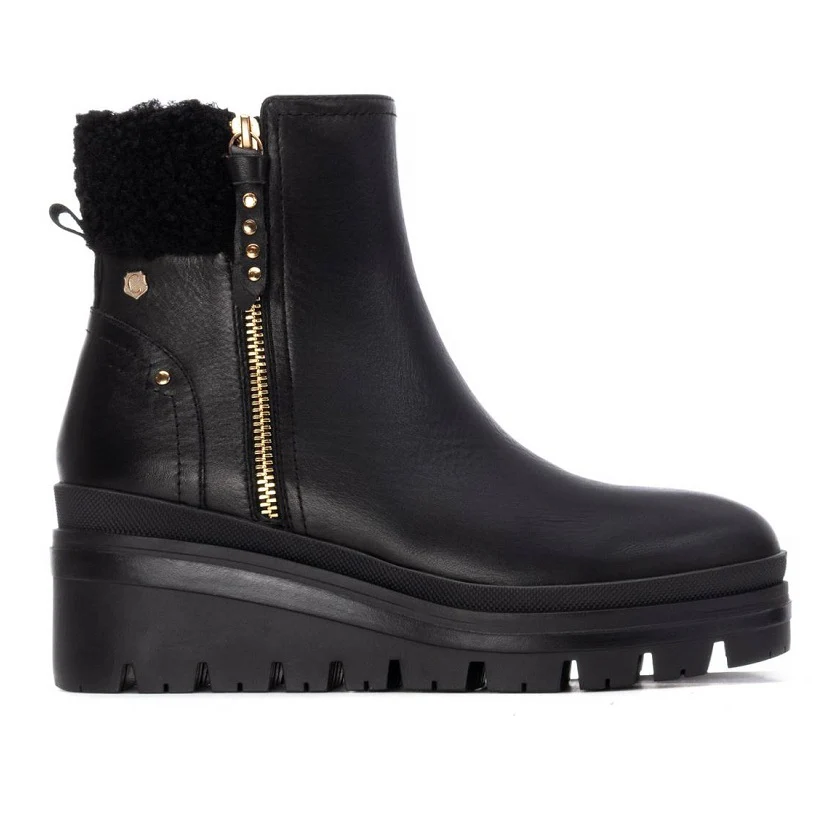 Botín de mujer Carmela que combina estilo y confort en cada paso. Confeccionado con piel, cuenta con cierre de cremallera lateral para un ajuste seguro y rápido. Su interior forrado en pelo cálido te mantiene abrigada durante los meses fríos, mientras que el tirador trasero facilita la puesta. La cuña de 8 cm proporciona estabilidad sin sacrificar elegancia, y la suela de goma antideslizante garantiza seguridad en cualquier superficie. Plantilla extraíble para mayor comodidad personalizada.