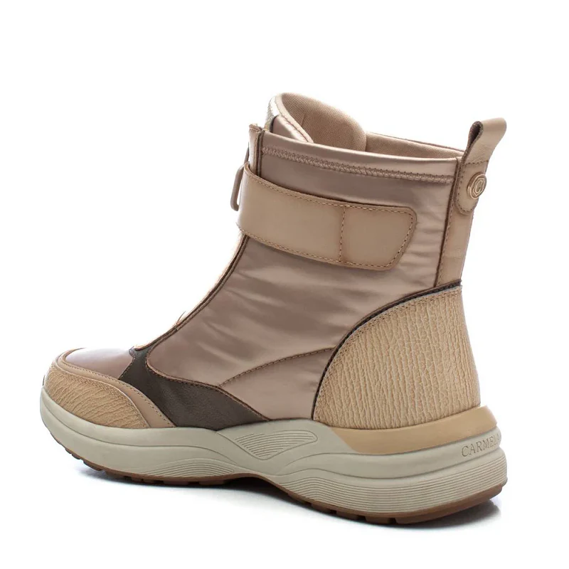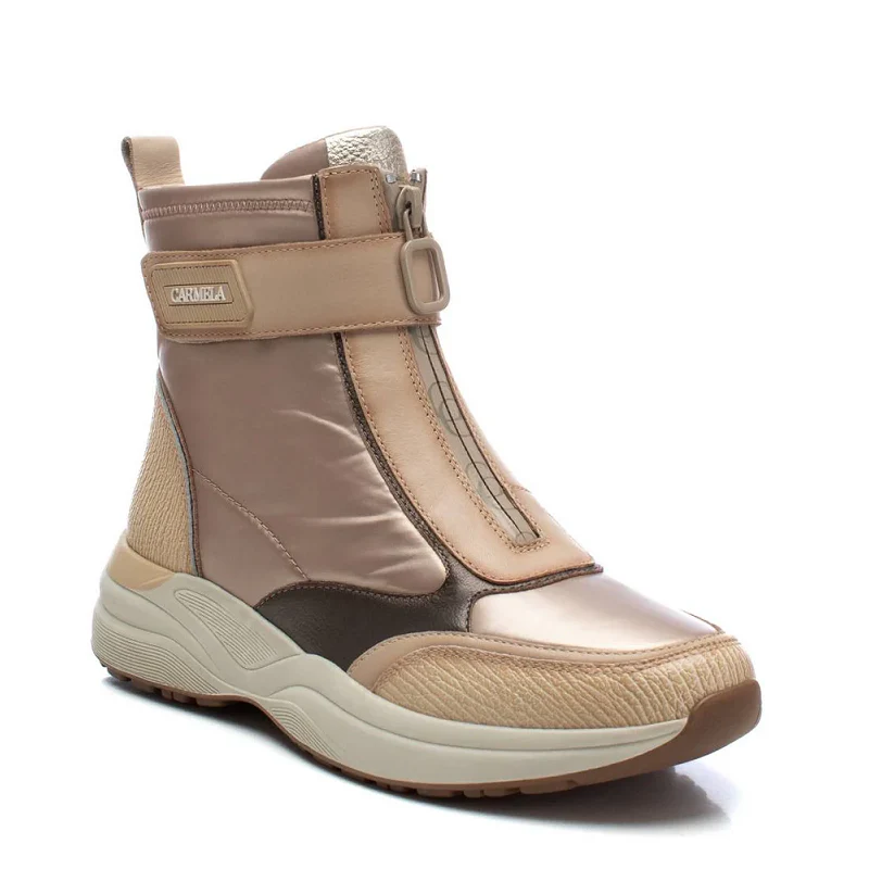 Botín de mujer, de la marca Carmela. Fabricada en piel de alta calidad. Cierre mediante cremallera y velcro para un mayor ajuste. Botín deportivo con suela gruesa deportiva de goma antideslizante. Con plantilla extraíble.