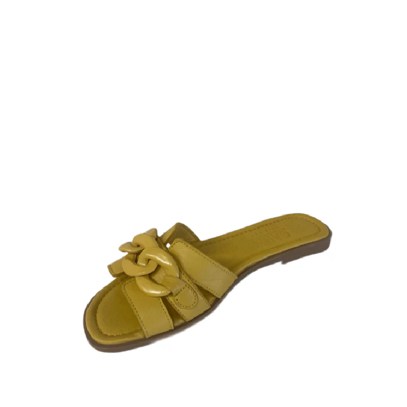 Sandalia de mujer de la marca Carmela. Fabricada en piel de alta calidad. Adorno de cadena al tono. Suela plana de goma antideslizante. Combinará con todos tus looks.